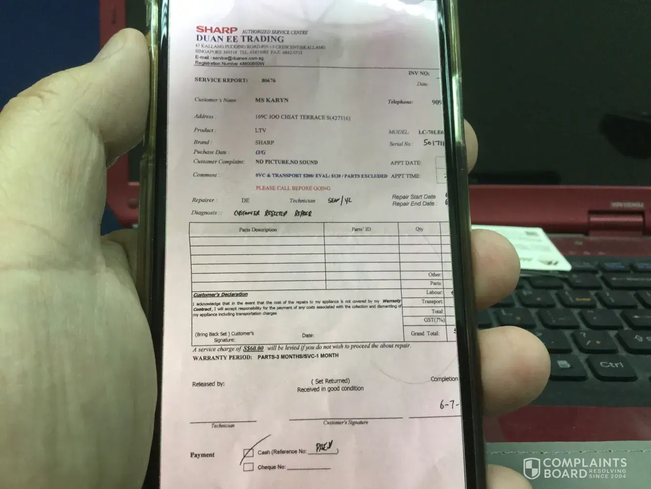 The technician came and within a couple of minutes, advised that the TV is beyond repair as the screen is at fault ! He readily gave a discount of $30 from the verbally agreed amount of $120 before he was sent here. I paid the fee but I felt very uneasy with this bad experience with a brand name that I highly regarded . Almost 40 years of faith in Sharp is not going to the drain because of this incident, I decided to write to you now to find out what you can do for a loyal customer.