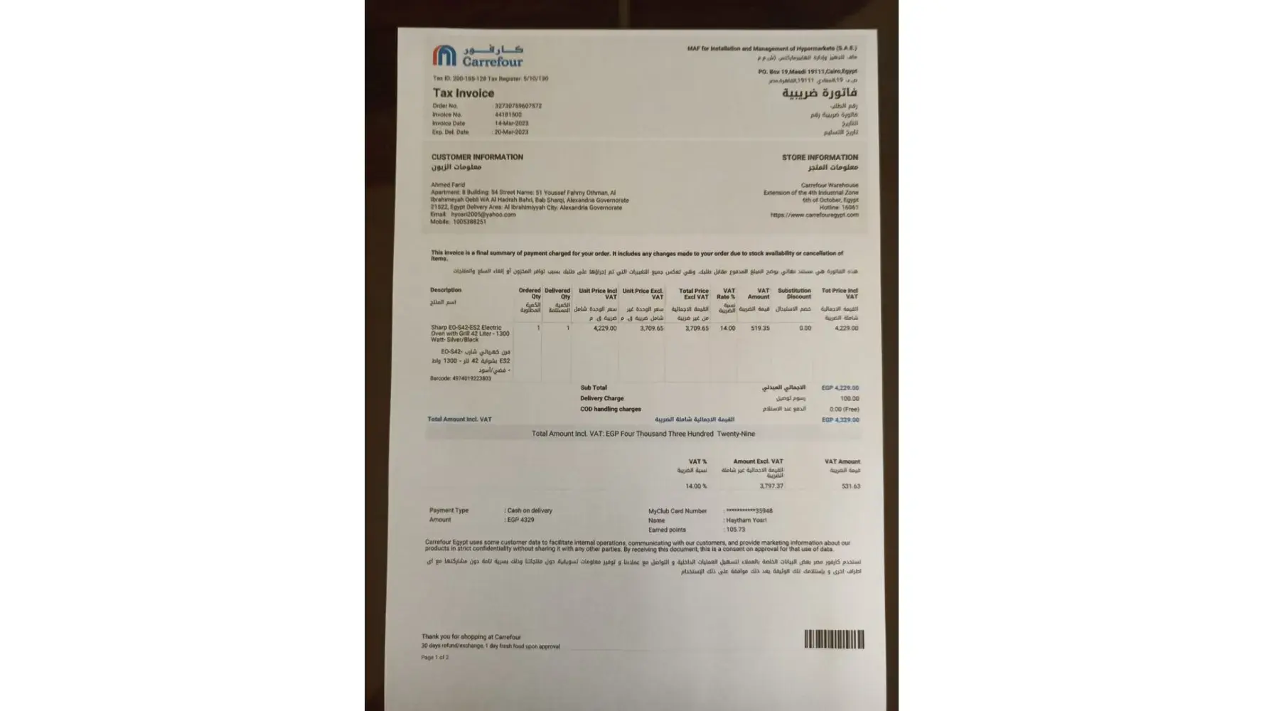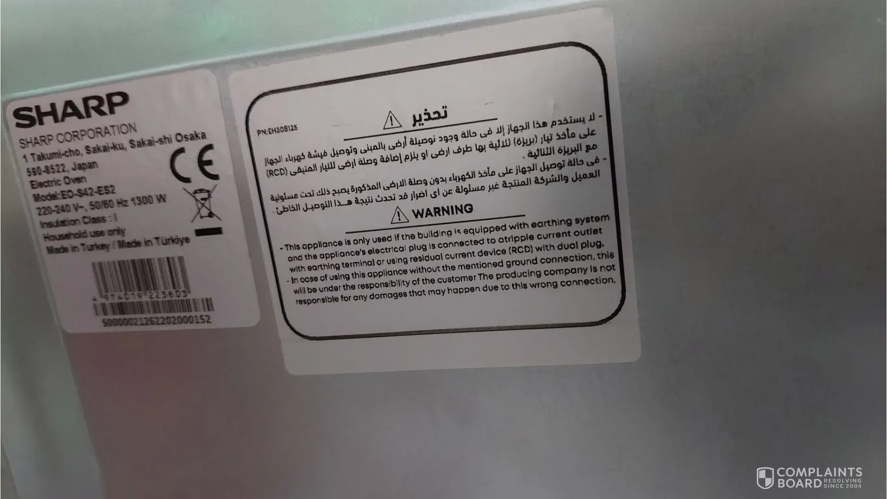 On March 20, 2023, I bought an SHARP Electric Oven 42 Liter, 1300 Watt, Grill, Fan, Silver x Black EO-S42-ES2 (Attached is the nameplate data). I bought it from Carrefour, Alexandria, Egypt.