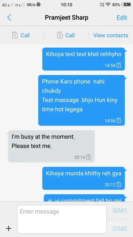 I'm busy moment please text me mayiny 21-08-2017 se continue phone or massage bhej raha hu per koi reply nahi mil raha