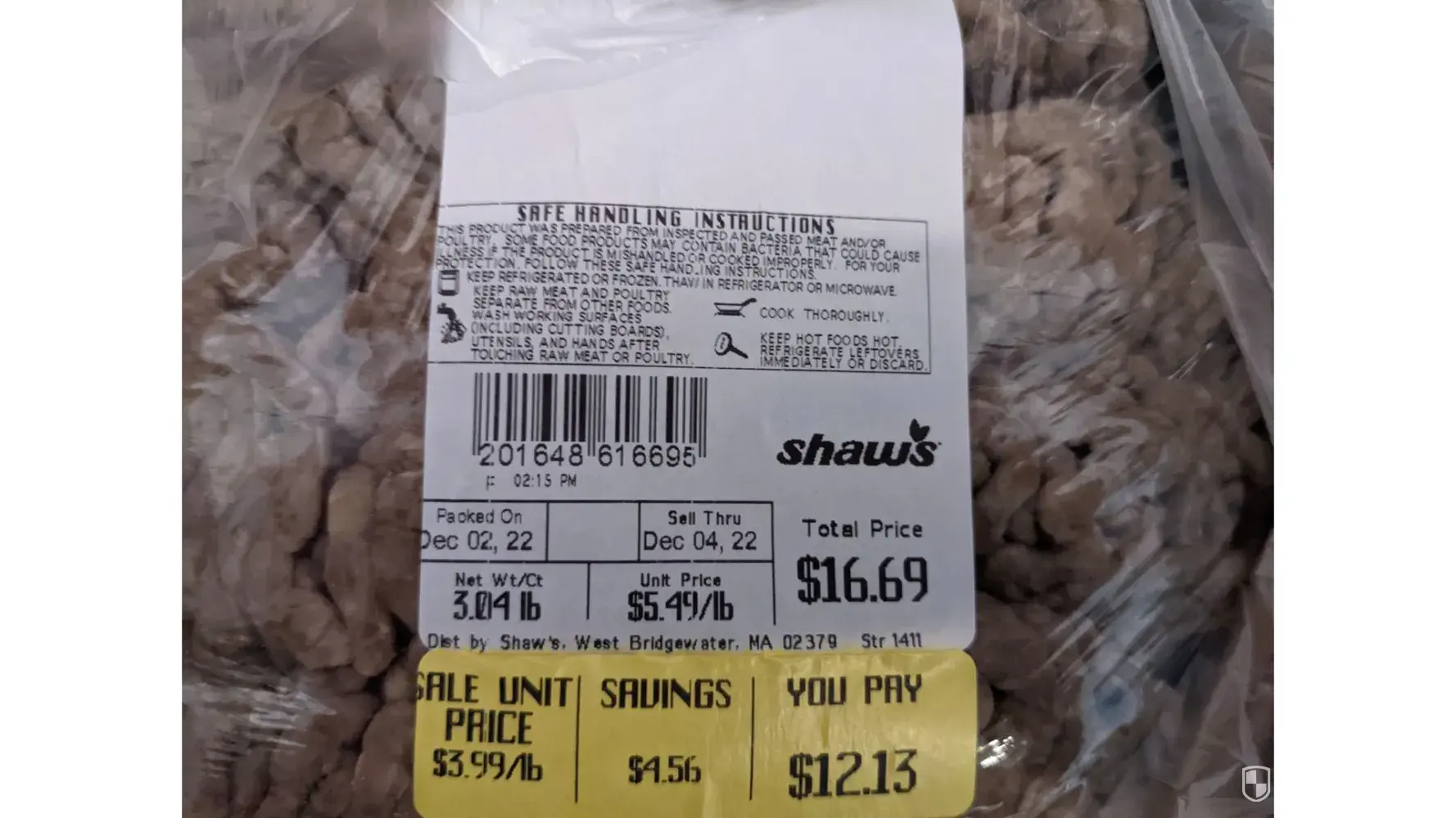 I shop regularly at the Shaws located on North Main St. in Fall River MA. This last Saturday 12/3/22 I purchased a family package of hamburger. The label indicated it was packed on 12/2/22 and sell through date of 12/4/22. I put the hamburger in my fridge on Saturday 12/3/22 with the intentions of using it the following day 12/4/22. When I pulled it out of the fridge on Sunday 12/4/22 the meat was completely brown on the outside and the vast majority of the inside.