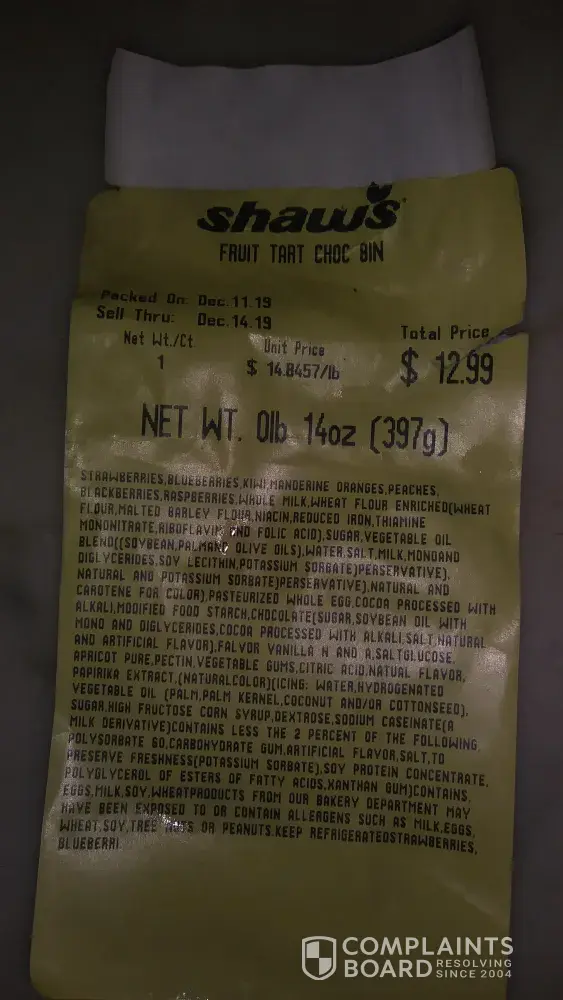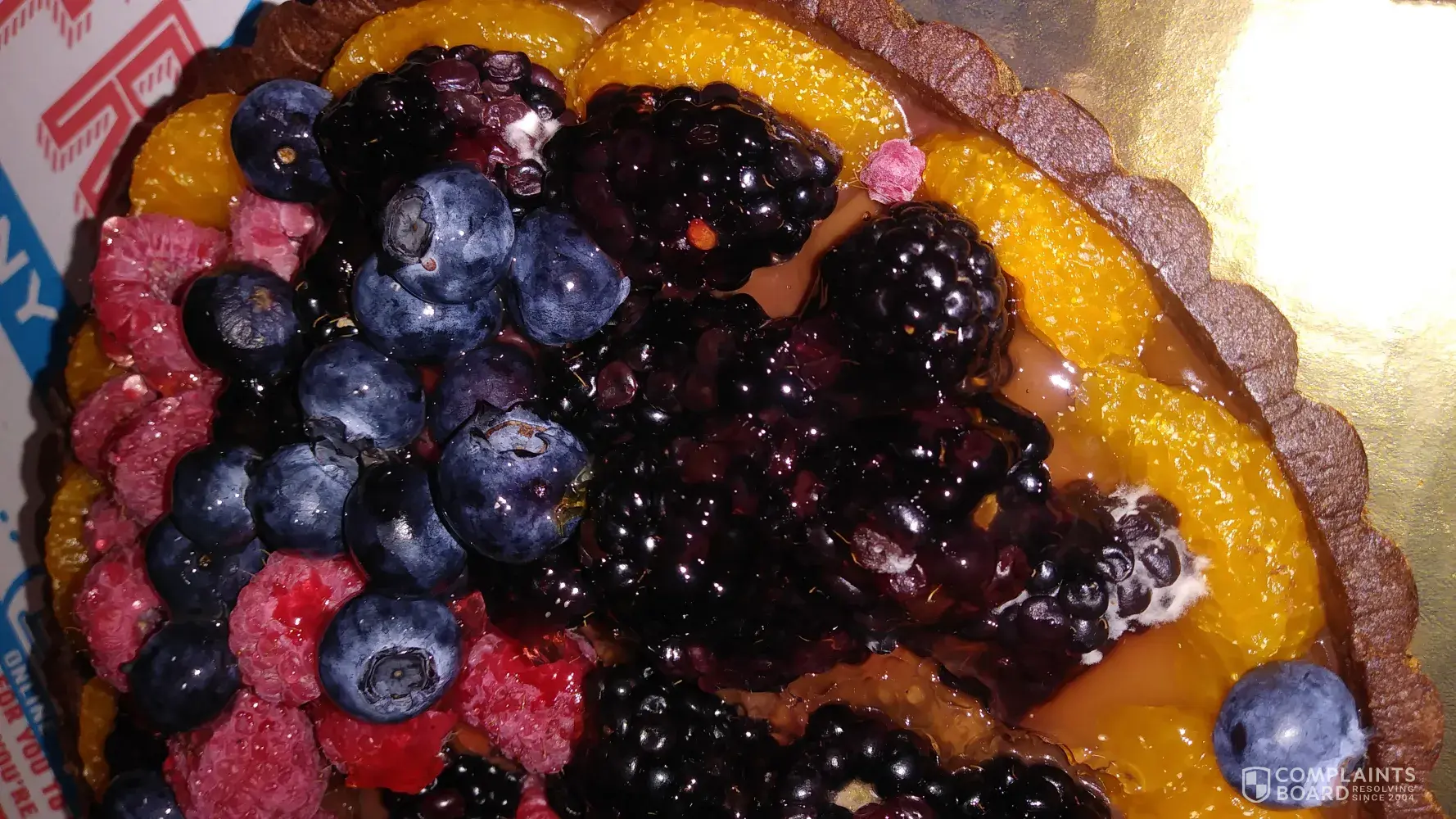 Purchased one of these desserts on Fri 12/13/19 for a family party on sat 12/14/19. While packing food away after the party I noticed MOLD on the berries on the bottom layer of fruit. That's after half the pie was eaten. I was pretty disgusted with this and wanted to bring this to your attention. I have included pics of the areas with mold and the label. I hope you can find a way to ease my reluctance now to shop at your stores.