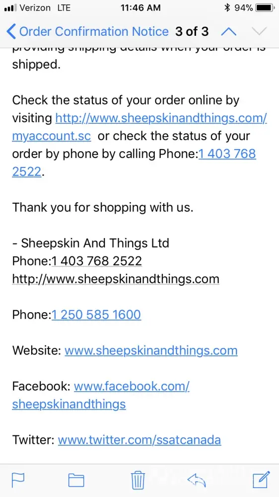 View your order invoice online by visiting http://www.sheepskinandthings.com/printinvoice.sc?encId=nQaxLydhjK5O0k9pibPBU9xNXiGMZg%2BNe0xcTlBwAo0%3D or check the status of your order by phone by calling Phone:1 403 768 2522.