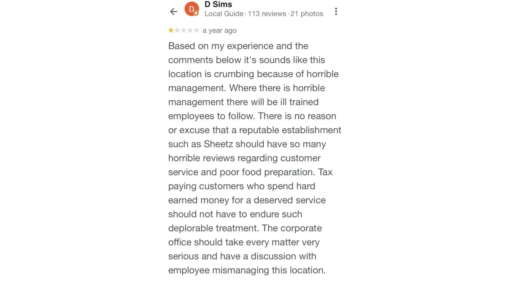 Desired outcome: I would like to see some compensation for my distress. Facility #443 needs some management and staff training refreshment. Since COVID Sheetz became our date place, order ahead, pay, then just pick up. Been married 50 years.