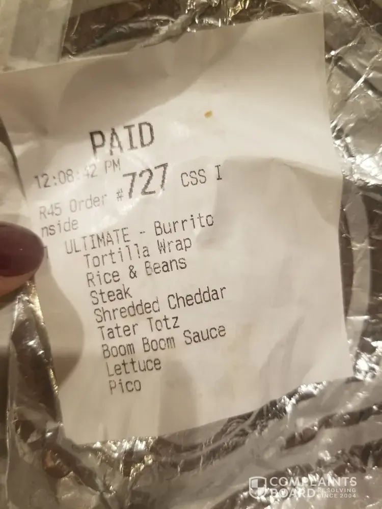 I ordered a MTO burrito, normally they are my favorite item on the menu. (I was a little dissappinted to see the menu item with the steak and tator tots wasn't on the menu anymore) so i proceeded to make my own copying the item. However upon arriving home and biting into my burrito, they had forgotten the boom boom sauce (which was on the ticket, i double...