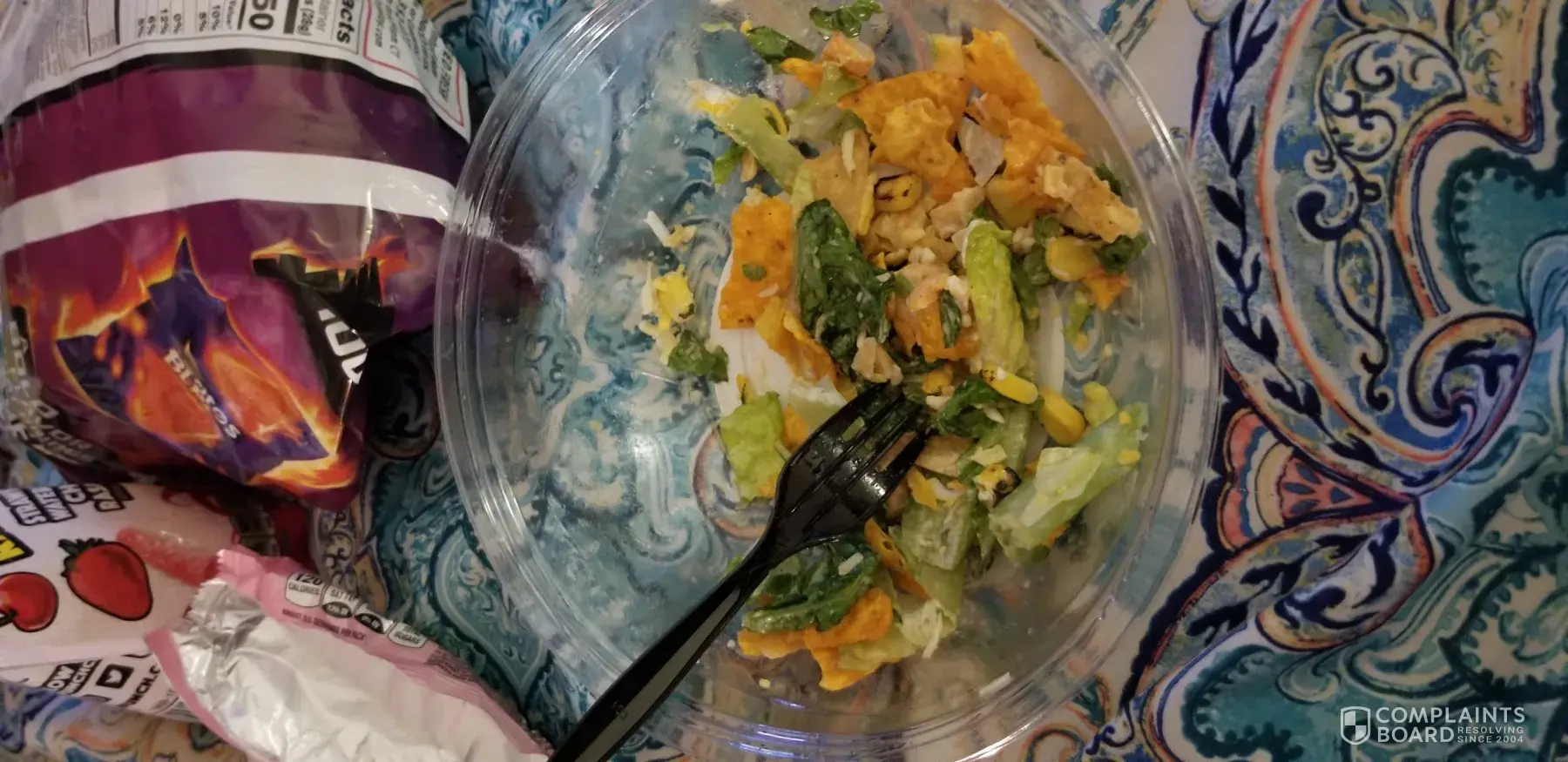 I bought the salad on 12/24/19 on ritner highway. I was sitting with my family while snacking on it, adding sweet chili doritos that I also purchased from sheetz and passing back and forth with my 15 yr old son. Half way through I picked up, what I thought was a piece of purple cabbage. When I chewed on it, I told my boyfriend and son that it tasted wierd...