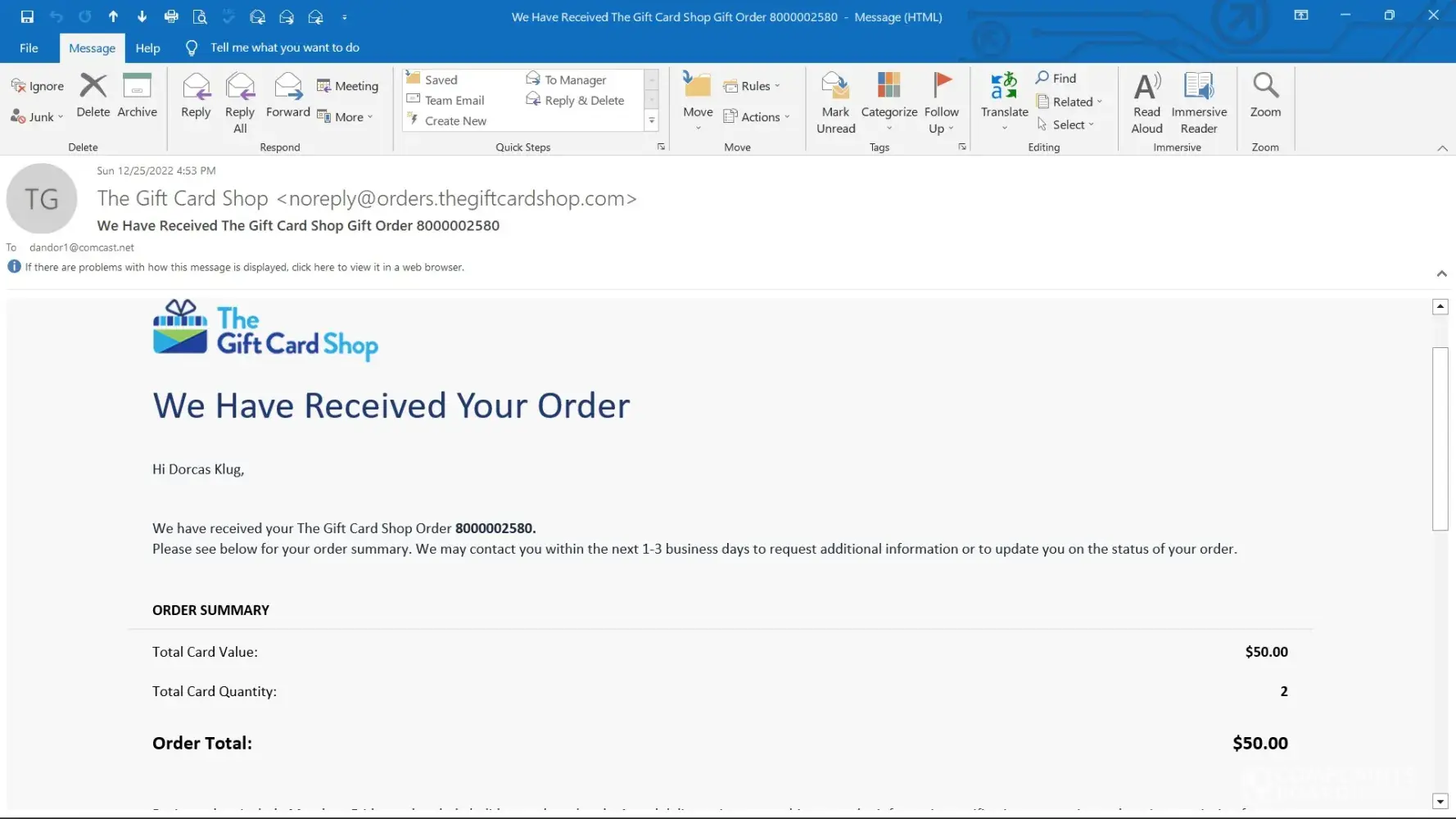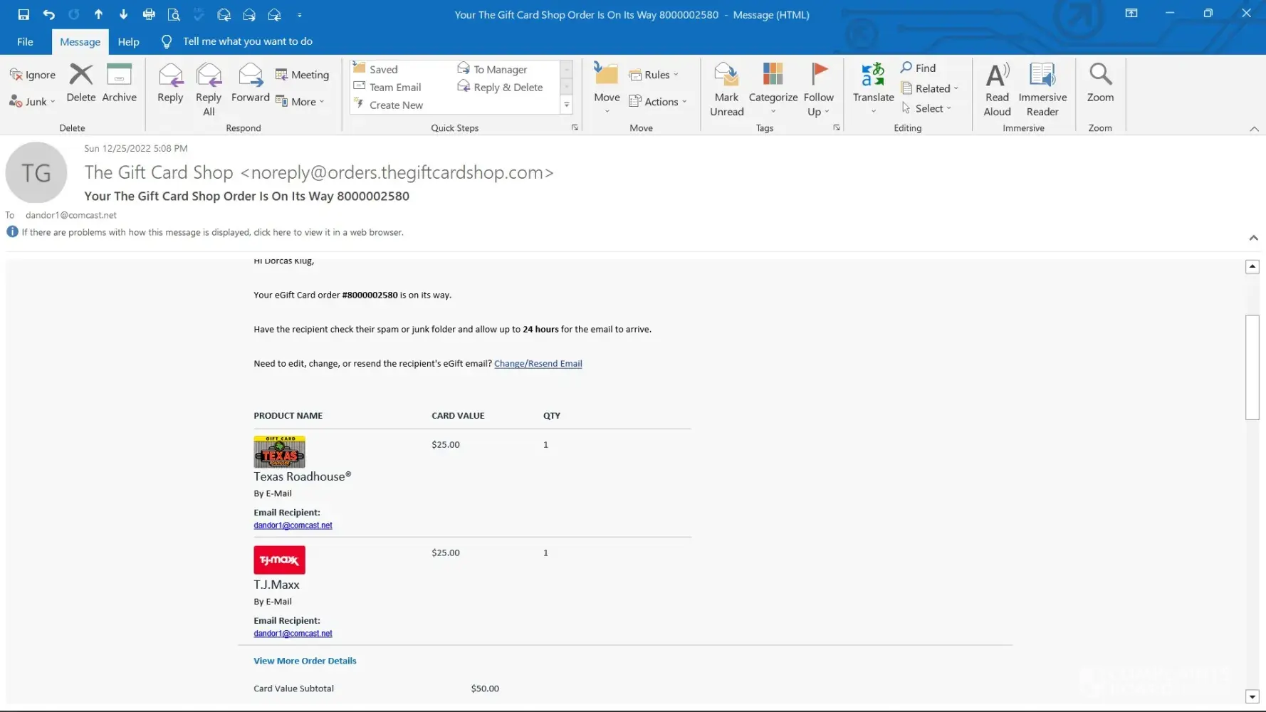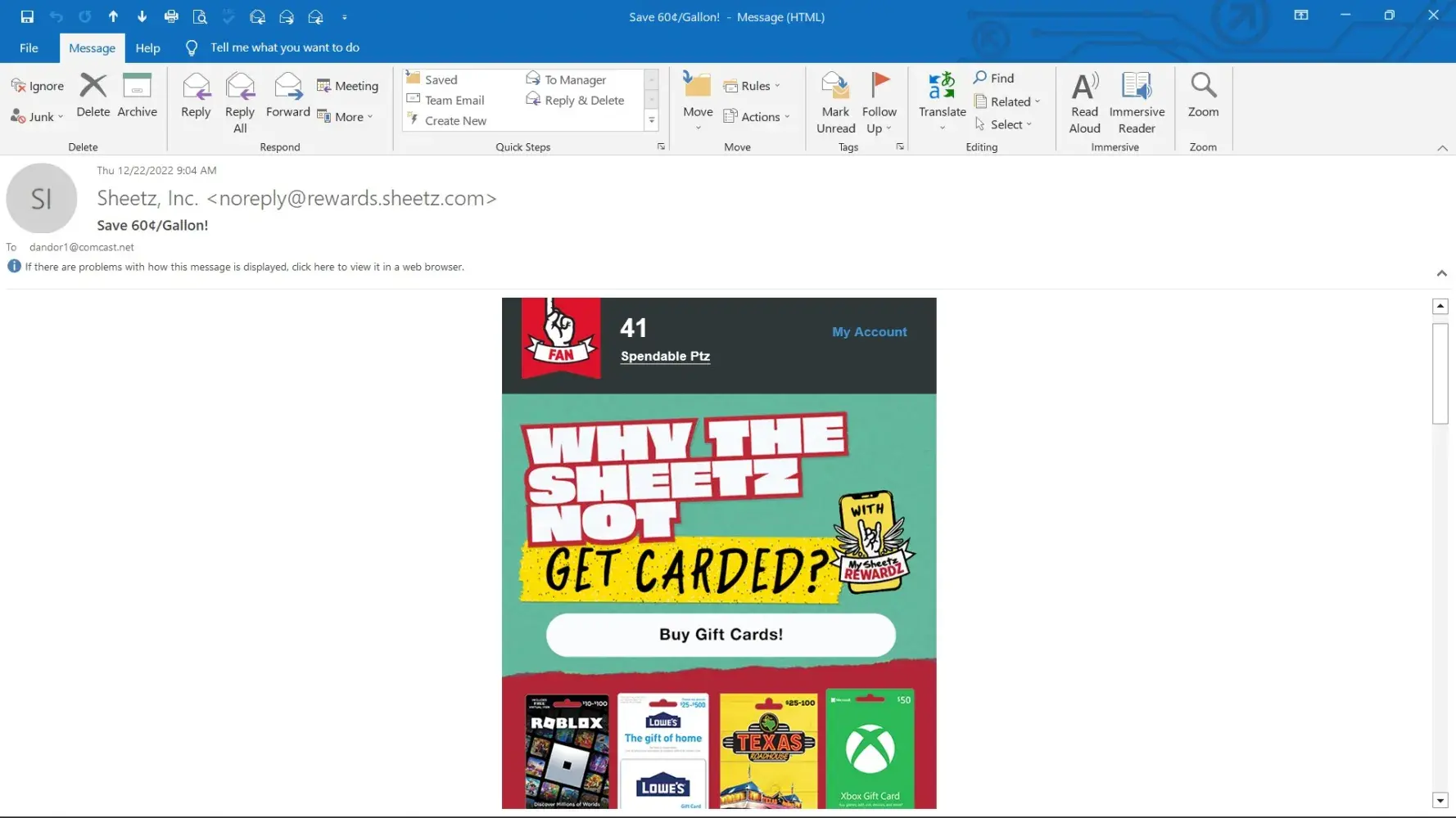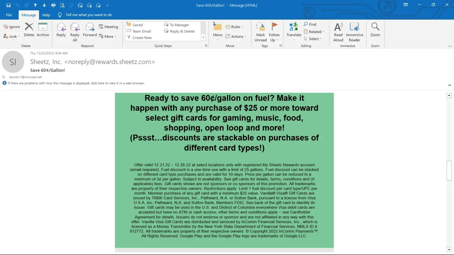 Desired outcome: $1.20 off gallon of gas up to 25 gallons as promised in email. Email [protected]@comcast.net. Card number [protected]. Email Offer, and Gift card purchase confirmation is attached.