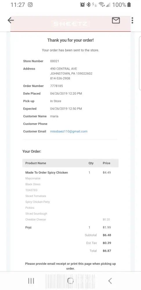 I frequent Sheetz by my job and ordered via my app 30 minutes in advance chicken sandwich w/ black olives and pickles and got lettuce and onions instead.Im not sure how they confused it. Fries are always undercooked so I never order them but took a chance today with fries and they were white and undercooked so I tossed them.I love the store but they screw up alot and since I only have 30 minute lunches I cant go into the store and rectify the problem everytime they forget my sauce or mess up my order. Thank you I hope you can figure out how to make it easier for people that pay alot of money daily for your business.