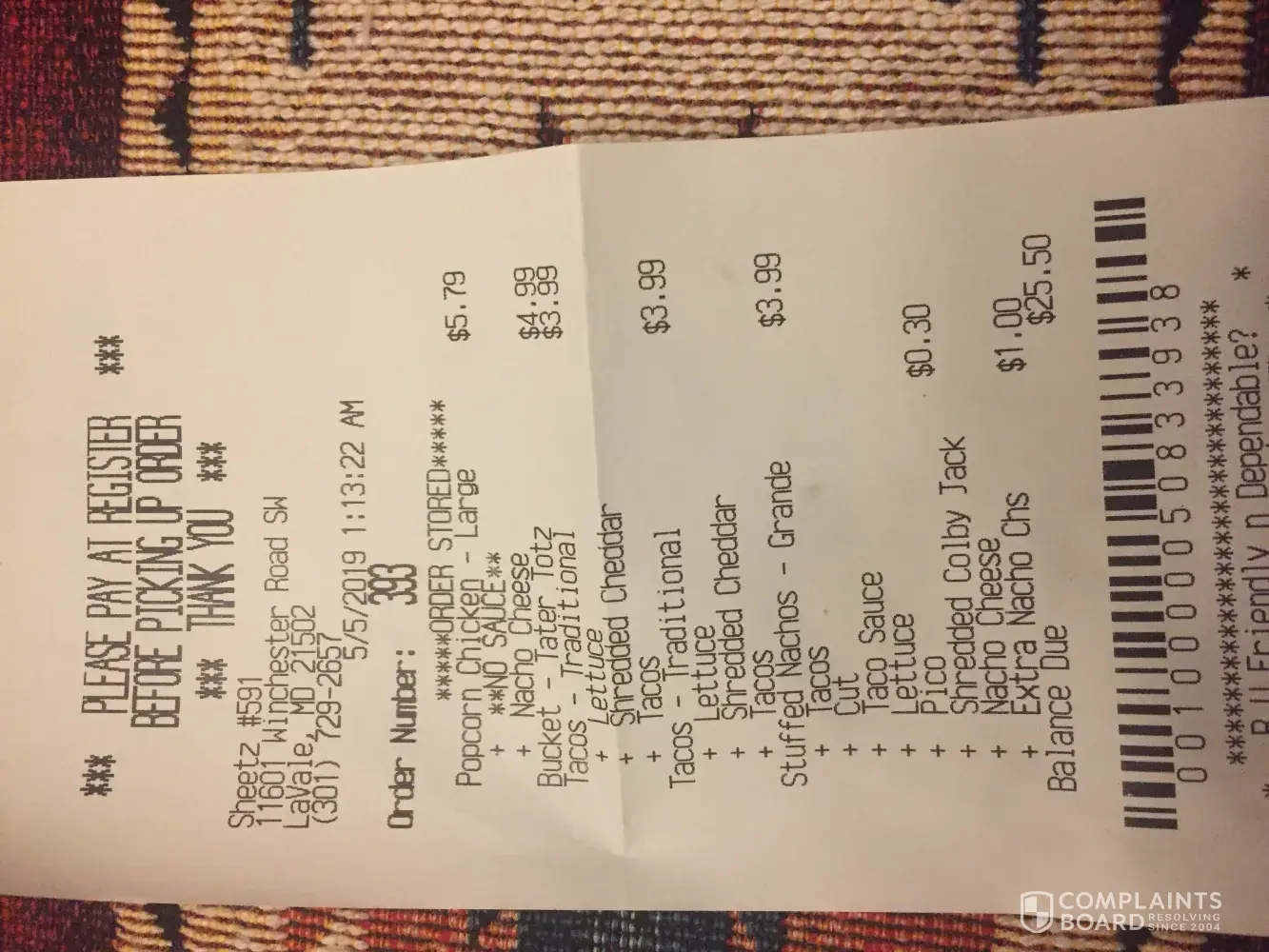 We just ordered food from store #591. Order number 393 on 5/5/2019 at 1:13am. We ordered a bucket of tots did not get them. Ordered stuffed nachos grande did not get the pick on them as ordered and there were a few of them that had no meat stuffing in them. This is not the first time they have forgotten part of our ordered but I am complaining now. We work...