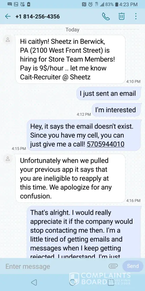 I would really appreciate it if the company would stop contacting me. I'm a little tired of getting emails and messages when I keep getting rejected. I haven't applied in over a year. I understand you will not rehire me. I'm just upset they won't rehire me after I put in 5 years. I love Sheetz. I loved where I worked. People make mistakes. But if I'm never allowed to work back at Sheetz, please stop contacting me.