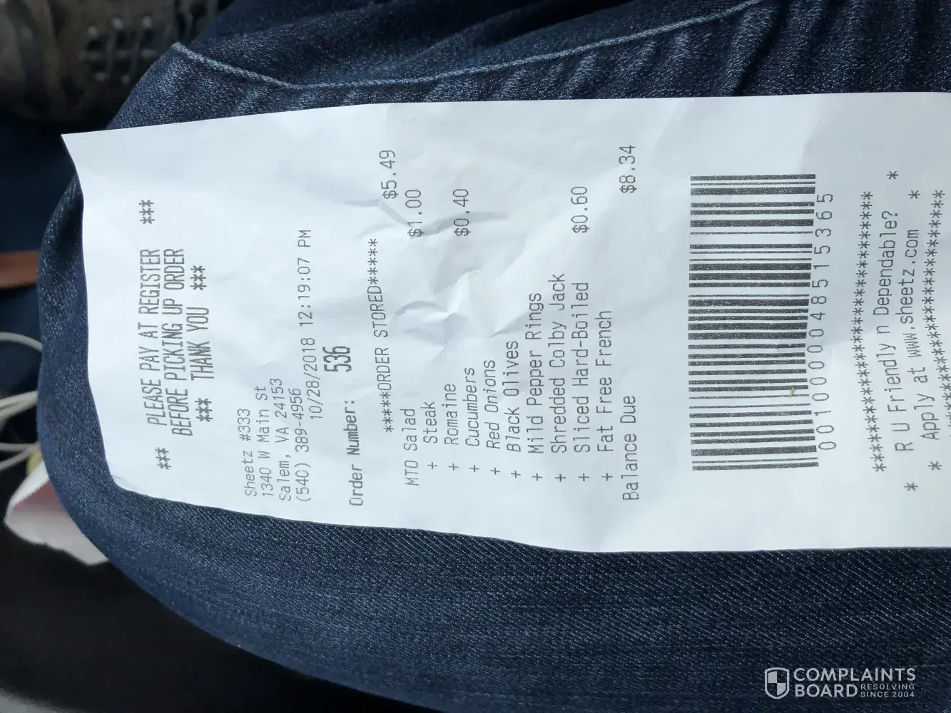 I ordered a salad with steak and when I went to eat my lunch there is not steak on the salad not to mention seems like alot less lettuce then I usually get and to pay extra for eggs to get I quarter of an egg. Very disappointing. Tried calling the sheetz and the phone just rings which makes it more frustrating.
