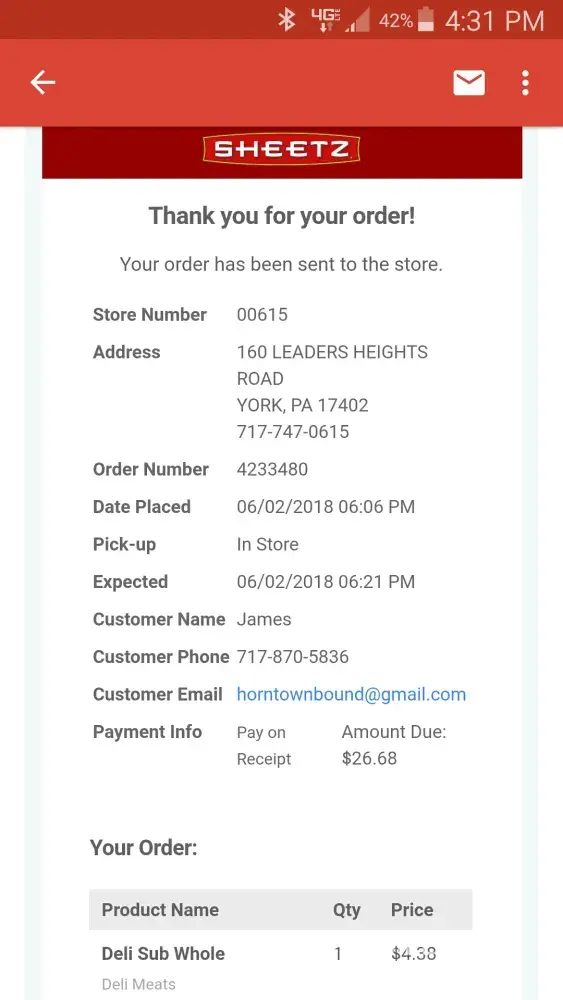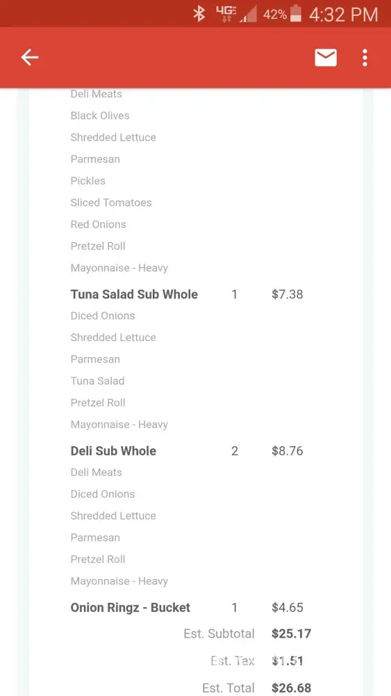 Went to pickup order, waited for it after 25 minutes after order time, paid for it got to vehicle realized that was never given order of onion rings. Had to go back in wait in line again for 10 minutes only to get my COLD onion rings. Then when we got home the subs were wrong. The attached pic was to have tomatoes and lettuce and did not have either. All the subs were to have heavy mayo and barely had any hardly any tuna salad at all for almost 8 dollars. Not a very good experience at all at Sheetz that evening.