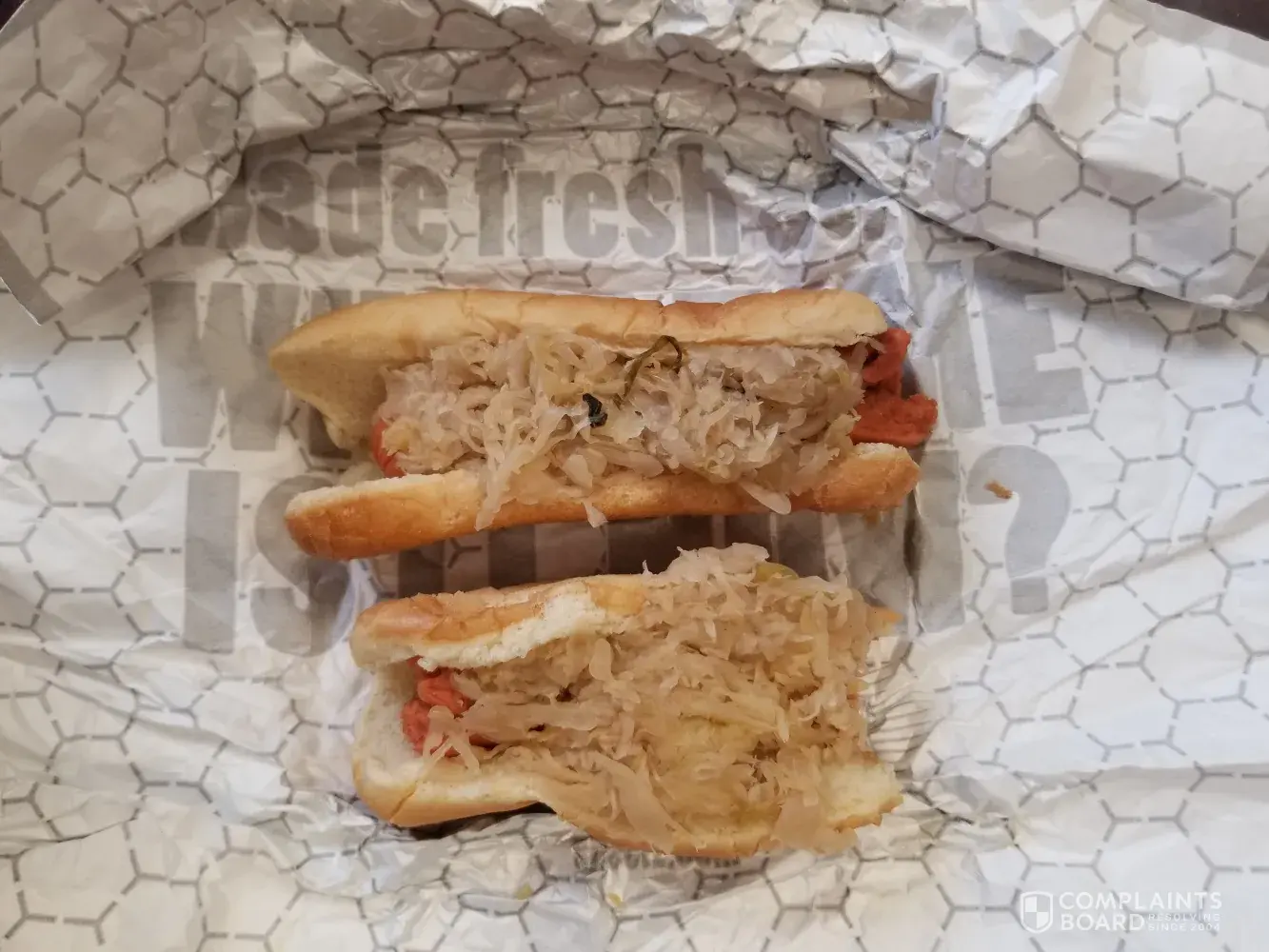 I order from Sheetz many times, but today these were my hot dogs. I threw them away. Disgusting! I have attached pictures of the hot dogs. The sauerkraut was inedible and the hot dogs were hard and rubbery and split on the ends. There was green stuff in the sauerkrauk that I hope was lettuce. I have not been back to this store to eat and I used to on a regular basis. The store is located at 4430 Winchester Ave. Martinsburg, WV 25405. The sore is #546.