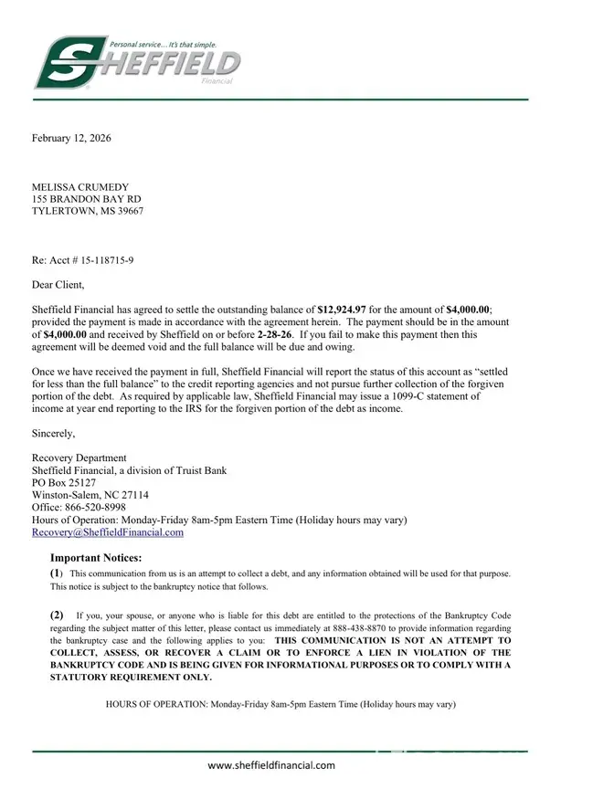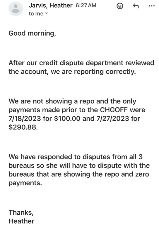 Sheffield Financial is reporting inaccurate and inconsistent information to the credit bureaus regarding my account. Sheffield has stated in writing that they are not reporting a repossession, yet my credit reports show severe negative reporting including a charge-off and incorrect payment history. Sheffield has also refused to provide written confirmation...