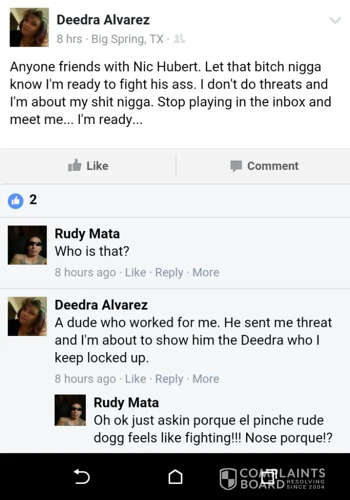 A manager located in Big Spring Tx posts on her facebook about her job and how she goes around the counter "calling people out" ready to fight them, put on blast former employees and talks about higher management and how they threaten her and how she cusses at them, I have gone to that store and she has her son working with her and he's running around, eating and she will get smart and tell you something when you tell her. I have all the screen shots to prove it. How can you have a manager that taunts customers that she don't like come in and taunt her employees? She refuses to submit applications of people she don't like since she can't do the hiring no longer. She's very unprofessional and a bully.