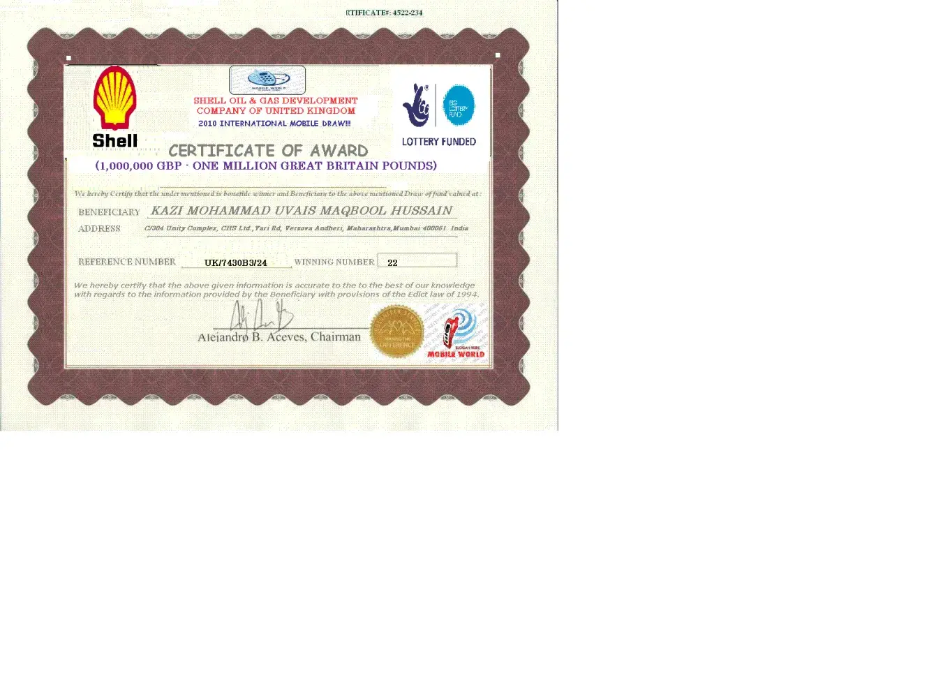 CONGRATULATIONS! YOUR MOBILE NUMBER HAVE BEEN VERIFIED TO BE AMONG THE LIST OF WINNERS IN CATEGORY "A" OF THE 2010 SHELL PETROLEUM INTERNATIONAL MOBILE DRAW AWARD. ON THIS REGARDS, WE NEED YOUR COMPLETE DETAILS TO ENABLE US ISSUE YOUR WINNING CHEQUE (GBP 750, 000.00 POUNDS) WHICH WILL BE DELIVERED TO YOU VIA THE ABOVE MENTIONED COURIER COMPANY FROM UK TO INDIA.