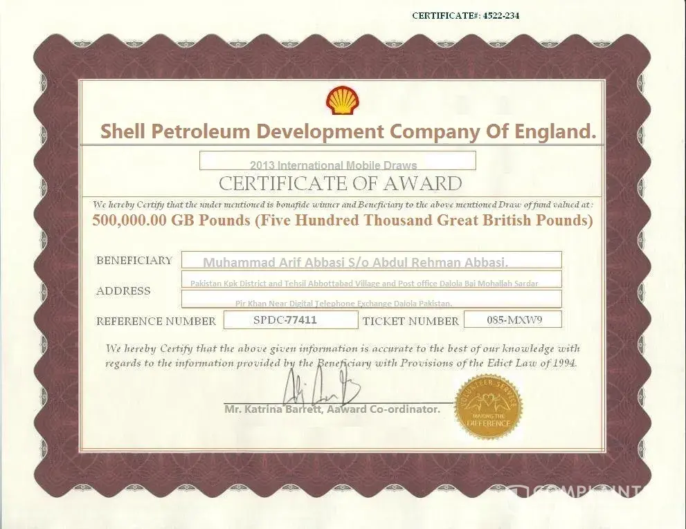 i recived Certificate of Award 2013 internatinal mobile Draws from SHELL PETROLEUM DEVELOPMENT COMPANY OF ENGLAND.total Amount of 500, 000.00 GB Pounds (five hundred thousand Great British Pounds) with this reference number. (SPDC-77411) and Ticket Number (085MXW9). i recived 10 emails from SPDC and Nationwide Bank of England. also i send email SPDC and nationwide Bank.