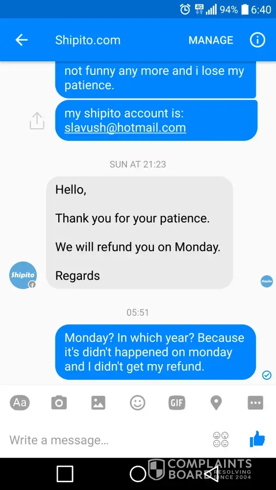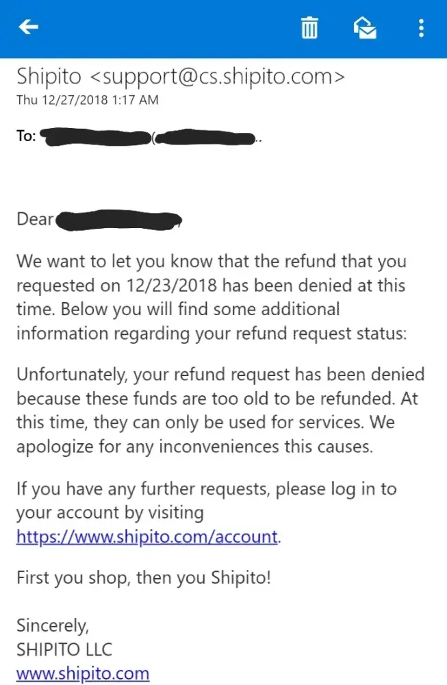 So I waited for this Monday and ofcourse nothing happened and the refund was not accepted. So I contacted once again with shipito on 2/14/2017 and than I was told that there is no requests in my account and no one knows what ia'm talking about.