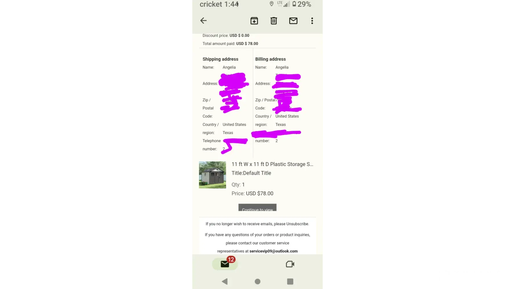 On March 10 2023 I ordered a 11 ft W x 11 ft D Plastic Storage Shed for $78.00. I reached out several times to the email address listed and I never received a response back. As a single mother of 3 every penny counts and I was/ am In need of a storage place for the kids and I. If their was a issue we could of figured out a solution but nothing from them in regards to me reaching out.