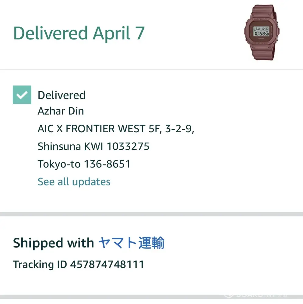Tracking ID 457874748111 as reference, I have two watches from Amazon that has been delivered on 7th April 2021 to my address in Japan l Azhar Din AIC X FRONTIER WEST 5F, 3-2-9, SHINSUNA Tokyo Japan KWI 1033275, but until today this shipment still not updated in the system. Please do the needful and communicate to me as well.tq