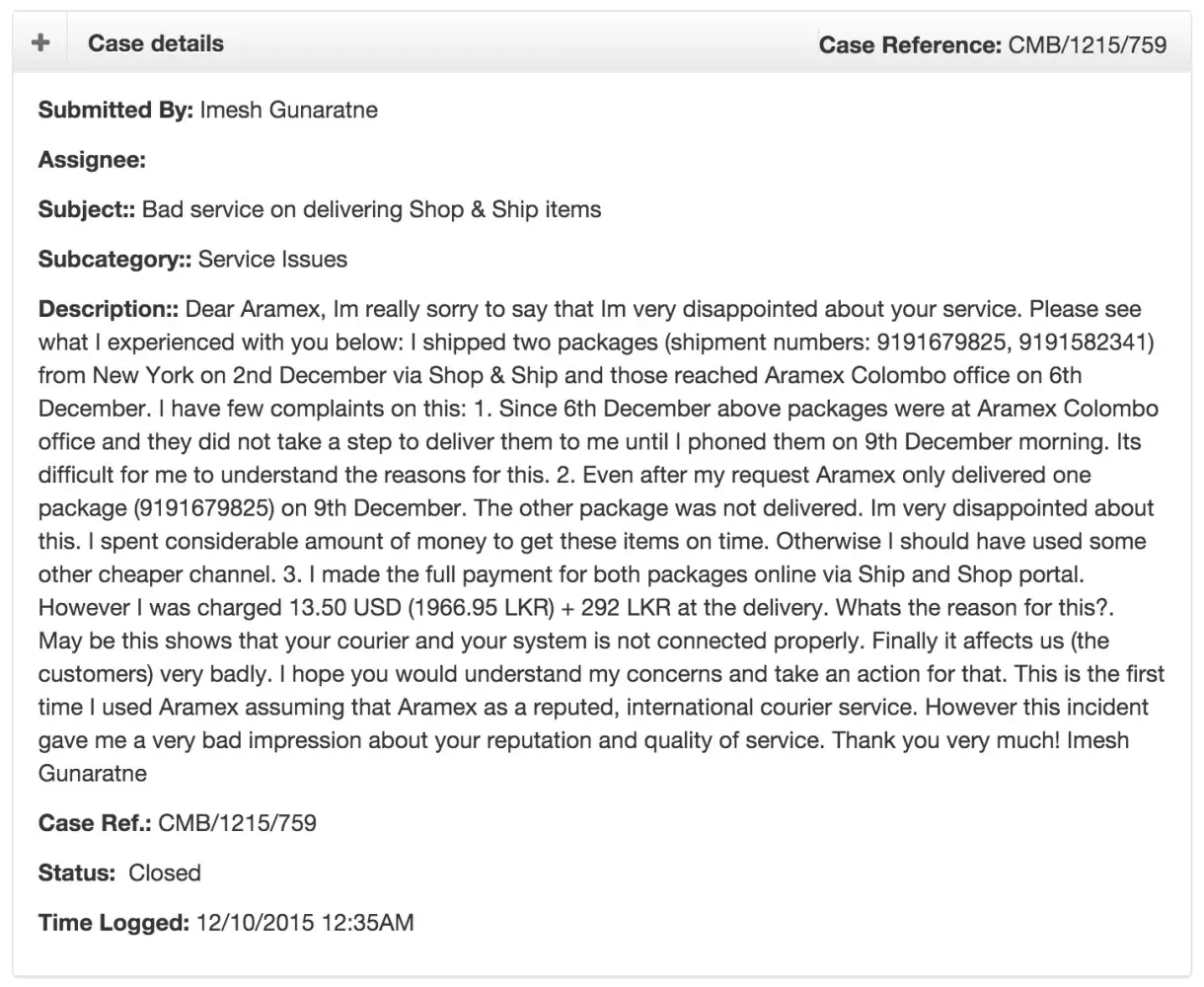 One of my friends was using Aramex Shop and Ship for some time in Sri Lanka and as a result I also created an account and ordered some items from USA during November 2015. My first impression and experience is extremely bad. I would not recommend anyone to use this service in Sri Lanka (I'm not sure about other parts of the world). This is mainly due to the unprofessional and poor customer service. This is what happened, I ordered few items from NY, USA in separate orders and experienced following issues: 1. Charging twice for custom duty for two orders: Aramex Shop and Ship online portal allows to make the complete payment for the shipment (this is including shipping and custom duty). However the currier who delivered the items charged me again as he did not had a record of the online payment. This is absolutely poor information management. These are the payment records for online payments made on custom duty: Paid By Card No. Expiry Amount Currency Reference Type Date PayPal xxx 12/99 2.39 USD 85526413PN254691K Capture 12/07/2015 PayPal xxx 12/99 4.77 USD 2RW04920C0767180W Capture 12/07/2015 Please see the attached image for the complaint I made on this on 10th December 2015. This complaint has been closed by Aramex without sending any response. I still did not receive a refund or any response on this. 2. Delayed delivery Aramex Colombo, Sri Lanka office kept two packages I ordered for two days for no reason. Once I phoned them, they said that they will deliver both packages on the same day, however only one package was delivered in the afternoon. Thereafter I talked to Aramex Colombo, Sri Lanka office again, what I heard from the person who answered the phone was, he cannot track where the package was at the moment and he will get back to me ASAP. But he never get back to me until I phoned them once again on the next day. Finally I received the package after talking to them several times on the next day. 3. Unprofessional customer service Due to the above problems, I talked to a person called Paddy Hoole at Aramex Sri Lanka office who manages the Shop and Ship service. The tone and the way he talked to me on the phone was very unprofessional.