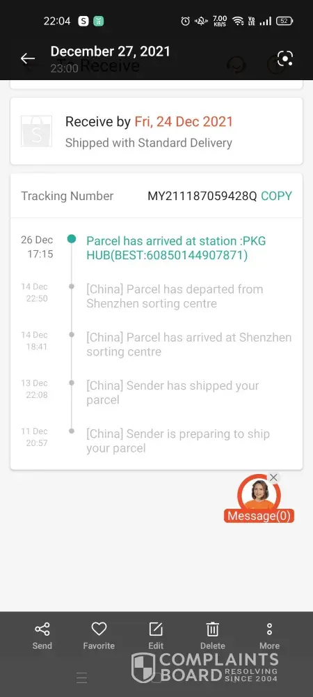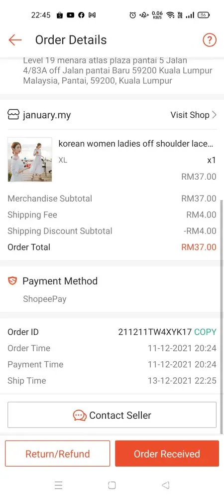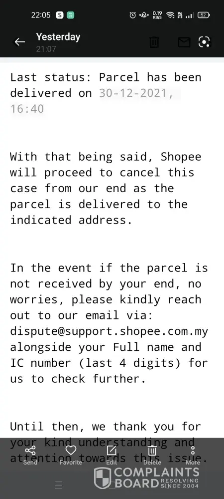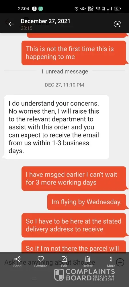 I have ordered a dress on 11/12/21 and estimated delivery date was 24/12/21. And to avoid any delay I have been following up even before the expected delivery date. And on 27/12/2021 I have informed customer service shopee that I won't be there in the stated address to collect the parcel after 28/12/21. But the parcel is been only delivered on 30th December. Which I already informed customer service shopee and the seller. I have requested for refund according to the seller advice on 28/12/21 after 6pm. But still the parcel is been delivered and when I raised enquiry on this no one responsible for any answer. Every single time, I have to reexplain to the person who is replying me. Now it's very simple. I have raised a refund and I want it. Beside that the service is extremely poor..