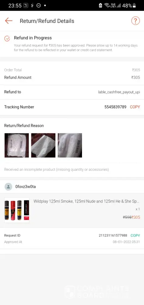 I had ordered perfume bottles. It was showing on the shopee app that 3 bottles of perfumes are of 305 rupees. So I ordered that on 31 dec 2021. But when it was delivered to me, there were only two bottles. So I returned that. I bought it by Cash on delivery. I had returned it on 2nd jan 2022. 8 days have already passed out. But i have not received my balance yet. The sender has also approved the return product. Then also I have not received my refund. How long I need to wait more ? This is really poor service. I have also provided my UPI id on the app but the also i have not got my refund. When i try to update my bank account details, it do not allow me to select my city of bank account. What to do now? I am attaching the important photos regarding it. Please look into the matter and reply asap. I hope you will understand my problem.