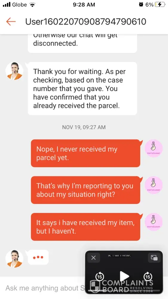 I contacted Shopee Chat and the agent that I talked to is ineffecient, typing icon for 2 minutes for a 1 sentence and it has been 20 minutes but wasn't able to resolve anything. User id of the chat agent is User16022070908794790610. Is the agent new? Took a lot of my time and waiting for his/her resolution but nothing happened, just wasted my 20 minutes for nothing. I told her about my concern and even gave her the reference number but it seems like she doesn't know anything telling me that per system I have confirmed that I received my item back even though I haven't received my item back.