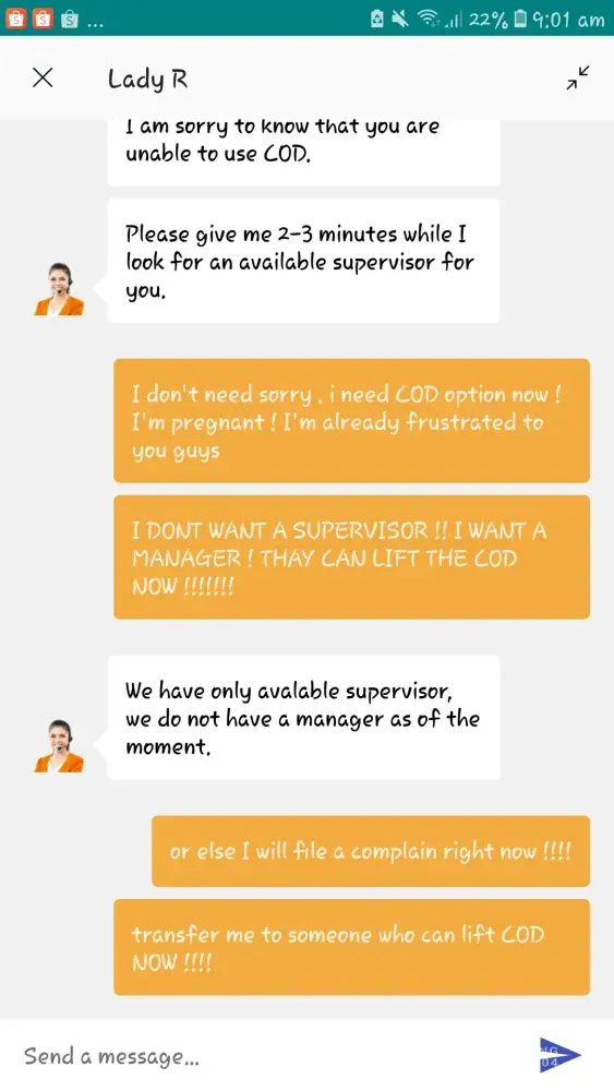 So, I supposed to receive 5 order, however because of an emergency called us no one will be available to receive the parcels before May 08 . Right after I knew that there's a possibility my order will arrive before May08 I reached the sellers letting them know that I won't be available to receive the parcels before May 08 if those will arrive earlier than May 08 . They told me ask the courier cause they already ship out the items and they don't have control with it . Okay, Since couriers haven't pick up the items yet, I contact shopee customer service first . Letting them know about my request to have it deliver before May 08, they said that they don't have control as well to the courier once they pick up the parcels. Okay fine . I contacted the courier every day I even get mad to them because they are unreachable but then one day when the parcels arrived to their warehouse they phoned me !let me know tht they can't hold the items until May 08 because they will have penalty they can only hold for 2 days I guess . So we agreed to have it reorder instead . As well as the seller ! Now the removed my COD option and they can't lift is right away . I'm pregnant and it's frustrating that I can't check out my baby essentials ! The supervisor that I spoke left the chat wihout informing me and resolving my issue ! I need to have it investigated !