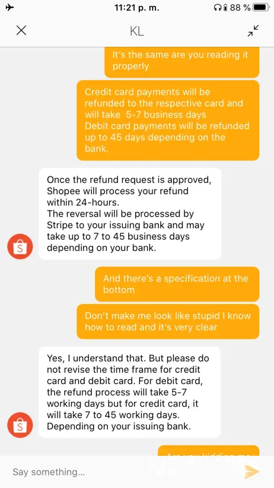 Cancelled my order last May 6th and was approved by seller the same dat. according to their help center, orders thru credit card will be refunded within 5-7 business days. Today, May 17th (7 business days after cancellation) I still haven't received any updates yet so I decided to contact their CS thru chat. The agent's name is Blessed and it was the most frustrating conversation I've ever had in my life. I pointed out what I have read from their help site (https://help.shopee.ph/ph/s/article/How-to-get-refund-for-Credit-Card-Debit-Card-1542963158805)