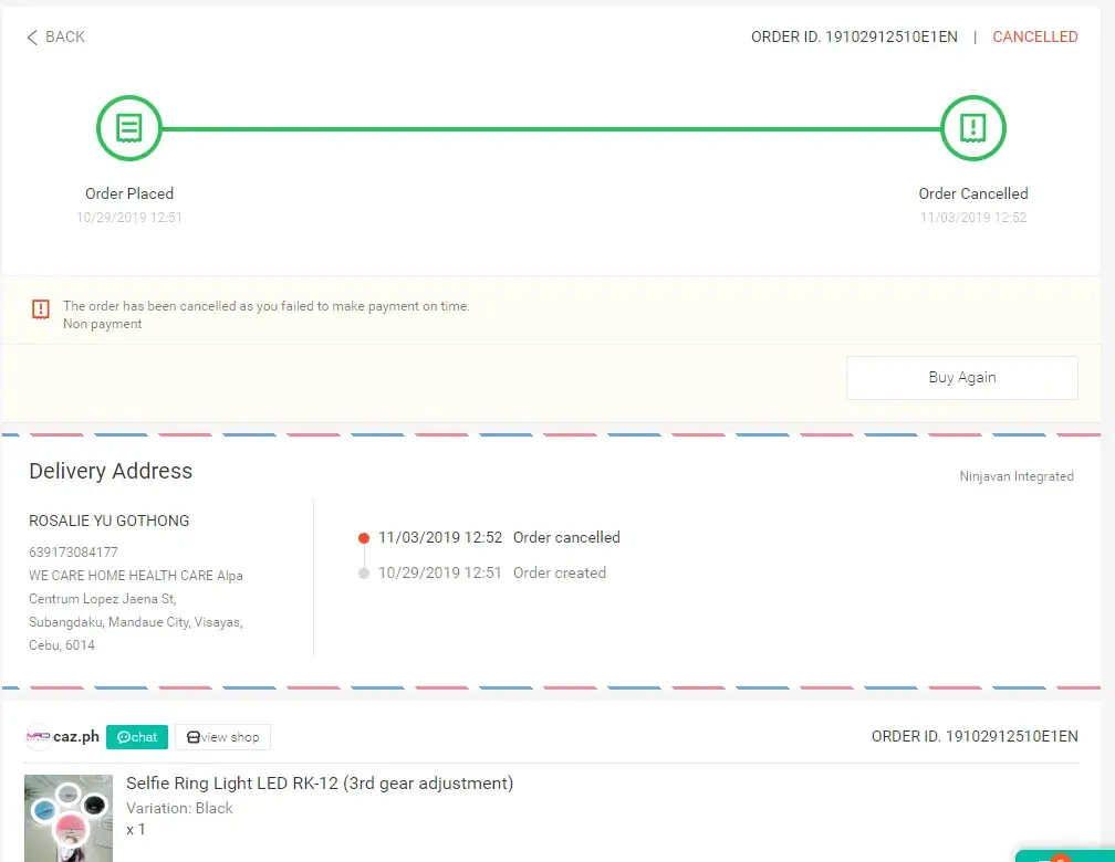 I ordered last oct 29, 2019 and made payment the following day oct 30, 2019.