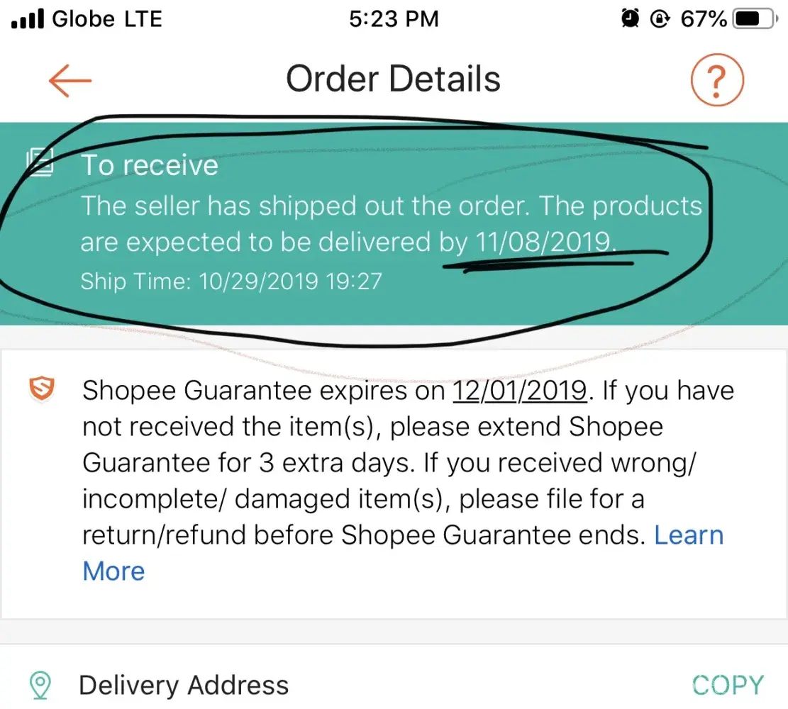 I ordered an elecetric scooter tire and the type of payment is via 7 eleven. Then this morning (Nov 12, 2019) Shopee texted me that my item will be deliver this day. Then I check my notification this evening and it says my Item has been delivered but I did not receive any item from shopee. My address is correct and easy to find because I already order others item a month ago. Please take action of this concern/complain because I really badly need this item I ordered. Please track it for me and deliver this as soon as possible.