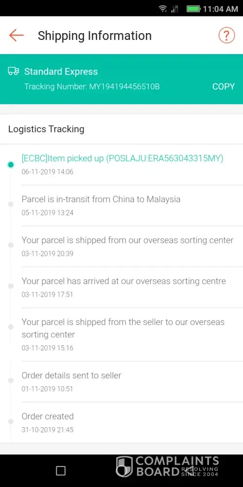 I purchase few items from Shopee Malaysia, after purchasing showing that the item was picked up on 06-11-2019 [pos laju Bandar Dato Onn].