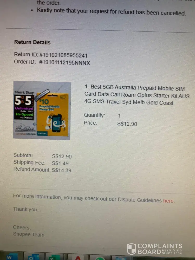Okay! According to your email, you claimed that you've verified the seller has sent the product and my request for the refund was cancelled. Is it that easy? What about me? I never received it until now. The parcel is sim card and it's supposed to get before I go to Australia. Now I'm already back in Singapore. What if the thing is lost in somewhere? What if the postman misplaced it? I already check with all the house members and nobody saw that thing. Why do I need to take those responsibilities? What if I ordered expensive things and happen like this then I still lose my money? That means you Shopee never care of your customer. Your service is just a piece of [censored]. I called to your customer service ph +[protected] for many times and nobody picked up all the time. What does that mean? Cheating Customers like that? I have been using this for around 2 years. Is this the way you treat to your regular customer? You and your app are not reliable and your shopee sell also. I send message then I cannot cuz that sgteknik blocked me. That is so funny. The true colour of you all so so funny... I want my full refund as soon as possible.