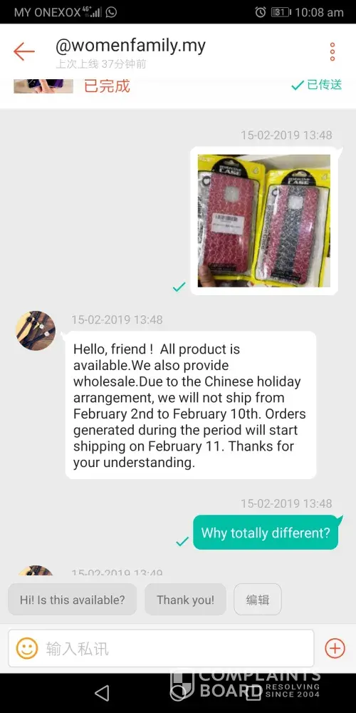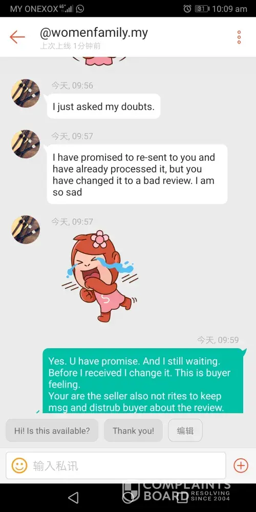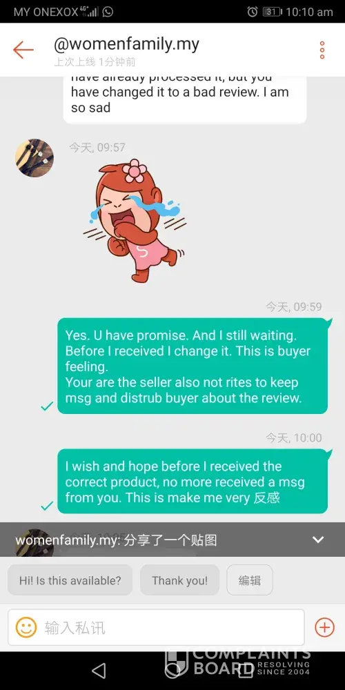 I received a msg from women family, they willing to send the cover that I order for me, I think is good service and happy they was responsible (between our communication for the resend product, the seller keep give me a wrong info, from I should no need to paid become I have to paid RM4.99) in the end I agreed with this.