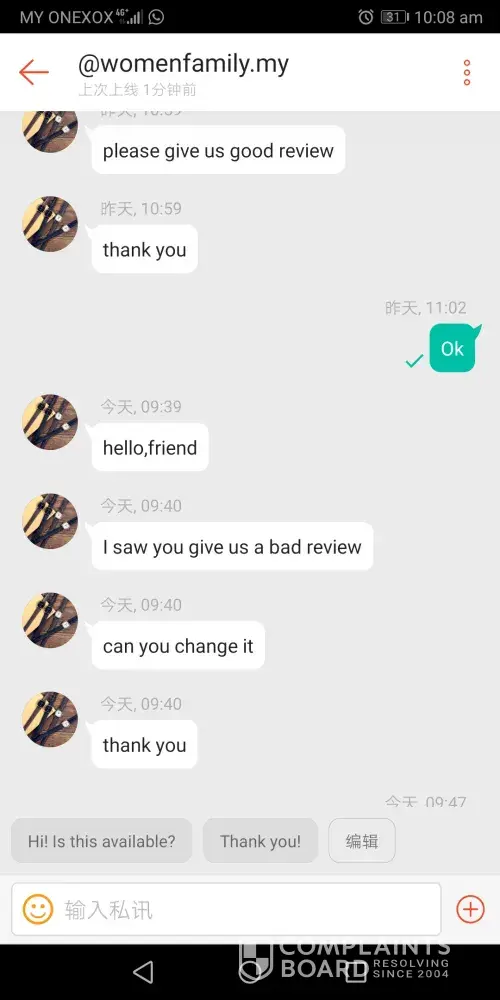 Seller keep msg me and ask me change good review, I was unhappy why the feeling like get force (review is given by buyer when they really feeling happy with the service and product)