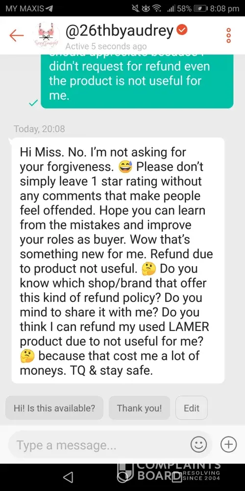 After getting the item 3 weeks later than the expected delivery date (2 weeks after order), the item that was sent to me was defective. I was forced to buy another product with the same function from lazada and it arrived the day after I ordered it. I then contacted the seller and asked if I can get a refund or an item replacement, I also provided pictures of the product and its receipt. The seller was rude enough to ask me to send a video of me connecting the product to my computer, assuming I didn't know what I was doing. But I still complied with their request, I didn't want to hassle myself from removing every cable behind my PC setup because its already fixed. And due to the fact that your chat system does not support the uploading of videos, I just sent pictures of my computer setup perfectly functioning with the other item I bought from lazada, along with their item just sitting in the middle of it all, showing that I used the other product that I bought rather that theirs. I also advised their customer service representative to refrain repeating to the other customers what he/she told me to do. Now I'm blocked from their chatbox and I can't even report the seller from your website...