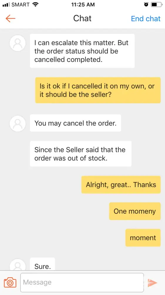 I have ordered an item, and used voucher code.. I have purchased that used using my hard earned money (it is not a free voucher code).. But since the item was out of stock (seller told me), that's the reason I have cancelled it (as per customer service rep advised).. I have a screenshot of the conversation I had with (lexy/lex), the rep that advised me that I can cancel the item on my own. It's been 3 weeks, I have called multiple times, chatted multiple times, and sent an email as well.. But no luck! It is not my fault if the item was out of stock! I have not received the item, so it means that I have to get my money back!