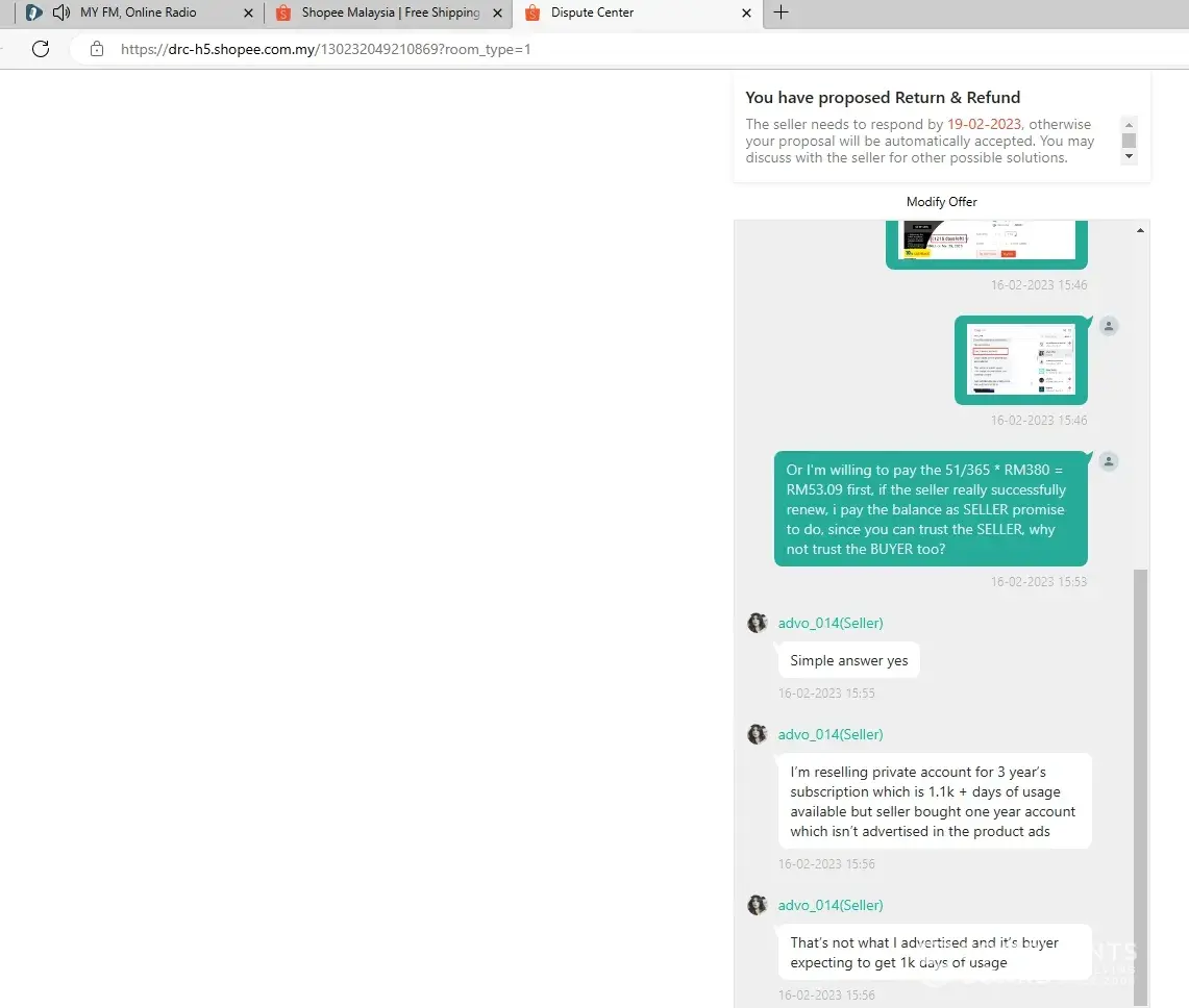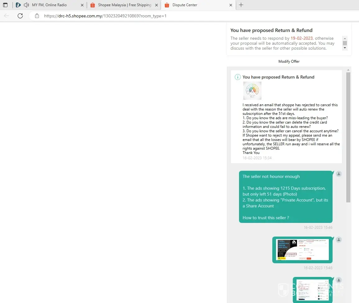 I bought a 365 days subscription service, once received the login id and password, the subscription left 51days, i have requested to cancel this deal because the service incomplete, but Shopee denied refunding and allowed the seller to renew the subscription when due after 51 days, it is ridiculous when the seller can refuse to renew, no body knows what will happen after 51 days later.