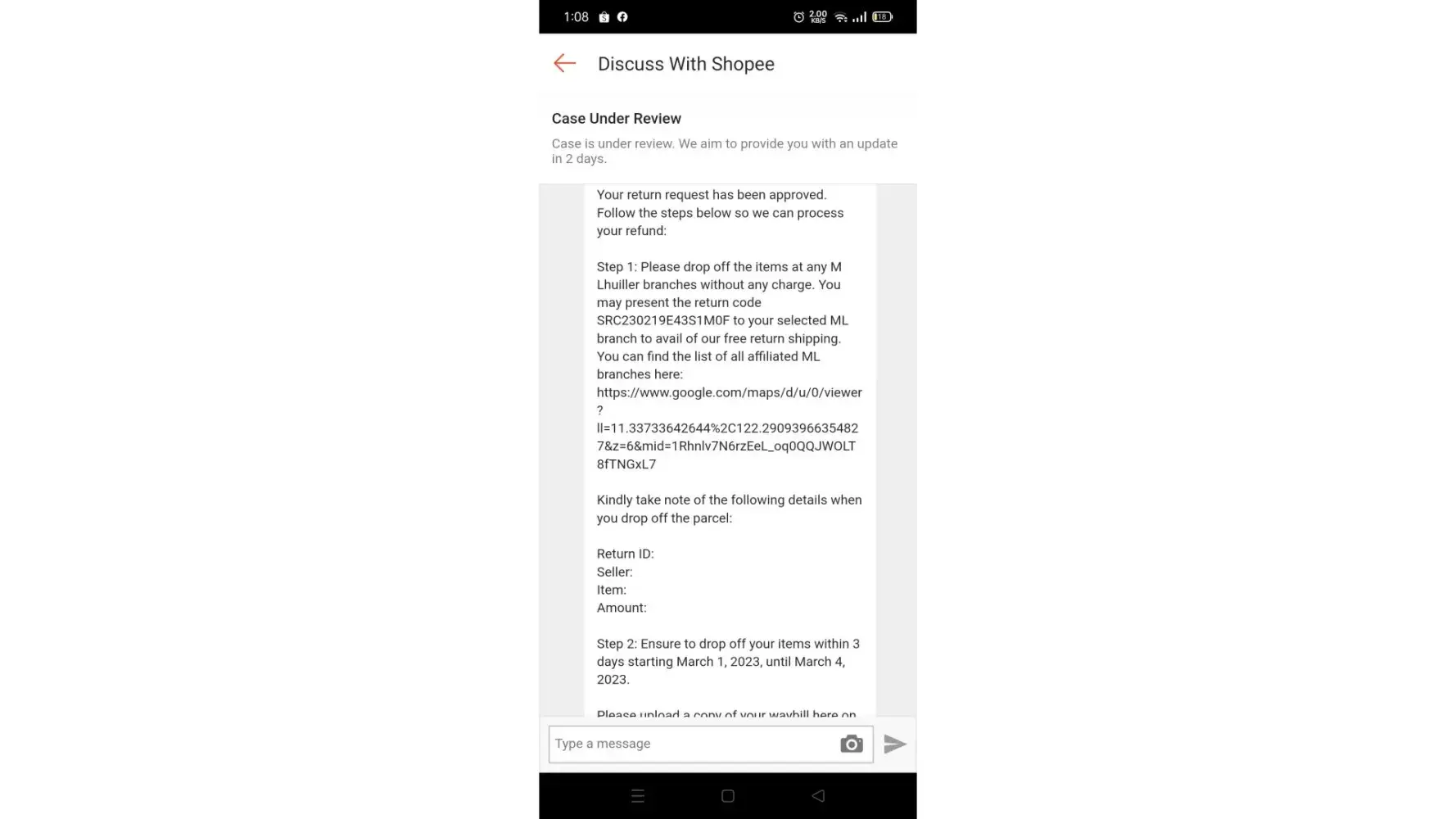 2nd attempt of my return that finally approved and received a notification via shopee applications. When I'm about to return it, The MLhuiller is asking for the return approval confirmation via email and refusing the approval of my return using Shopee app. So inaccurate process. So i wasted my time and money for my fare carrying a heavy item returning it back to my house and spoke to multiple live chat support and to the Manager that was so unhelpful