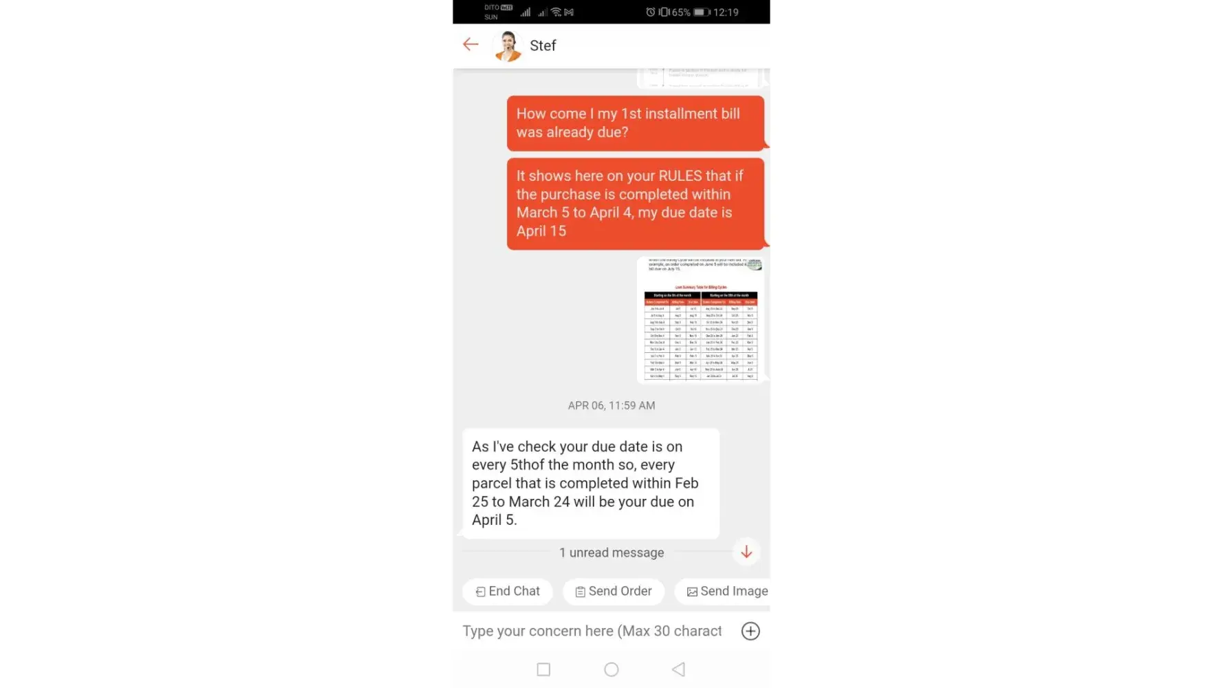 I placed two orders on March 15, and completed/received the items on March 18 and 19 respectively. My 1st Monthly installment was billed yesterday and is already overdue today, when it is less than a month when I purchased the items? It shows on their rules about billing cycle and due date that from the 5th of the month when the purchase was made, to the 4th of next month, the due date will be on every 15th. I already talked to one of their chat representatives but no resolution was taken.