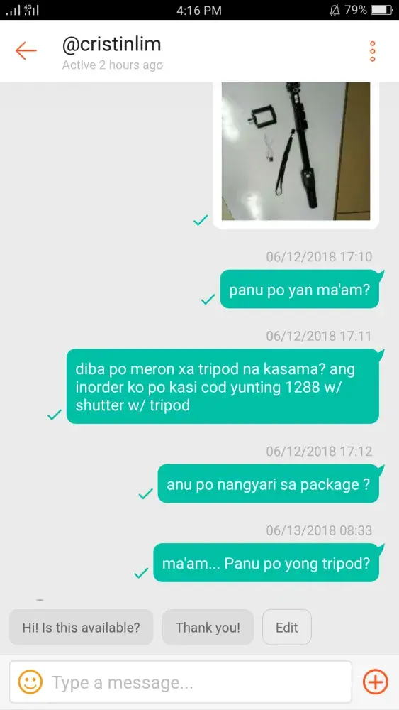 nag order po ako ng yunteng 1288 monopod w/ tripod w/shutter, dumating yong order ko monopod lng w/ shutter, walang tripod, hinanap ko ngayon, nag chat ako ky cristinlim na seller, sabi pic ko daw po, send ko sa kanya, sabi nkalimutan daw ng tao niya, mag place order daw po ako ulit, umorder ulit ako, sabi ko isama nlang yong tripod, ok daw, ngayon dumating na ung order ko, wala pa din yong tripod, sabi niya iba daw yong nka assign na tao. Kami po yong nag usap eh. gusto ko lang naman makuha ko kung anu yong binayaran ko.