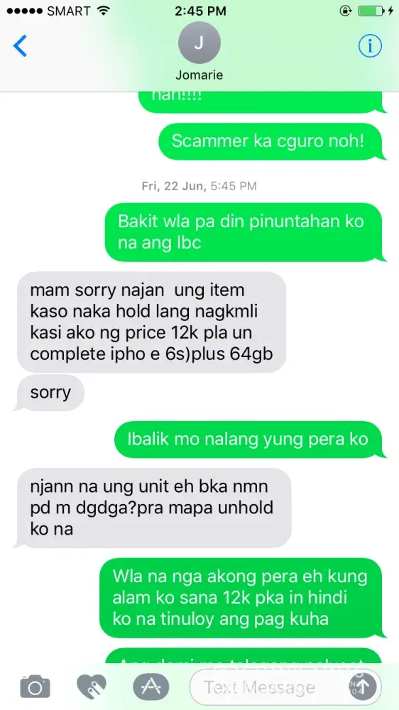 I ordered iPhone 6s + that cost 9, 000, so I texted the number appeared on the chat. Then the seller told me that the item was still available and He hurriedly told me that I need to pay tha half of the amount thru gcash remittance and the remaining half payment will be given if Got the item. So I paid it and the suddenly the seller told me that It's better to paid it in a full amount so that there will be no hussle so I did it I paid the full amount then he always told me that he already ship the item. But there's no item delivered in LBC so I texted him he got so many reason about the delay he said that the said item is a package I should buy the iPhone 6s because it's a package. So I refuse then suddenly he told me that the item was supposedly 12k I have to pay the remaining amount because the item got hold he can't get it to the main seller so that time I already found out that it's very suspicious and I think I got scammed it's been a week already he didn't return my money yet. Please help me get my money back.