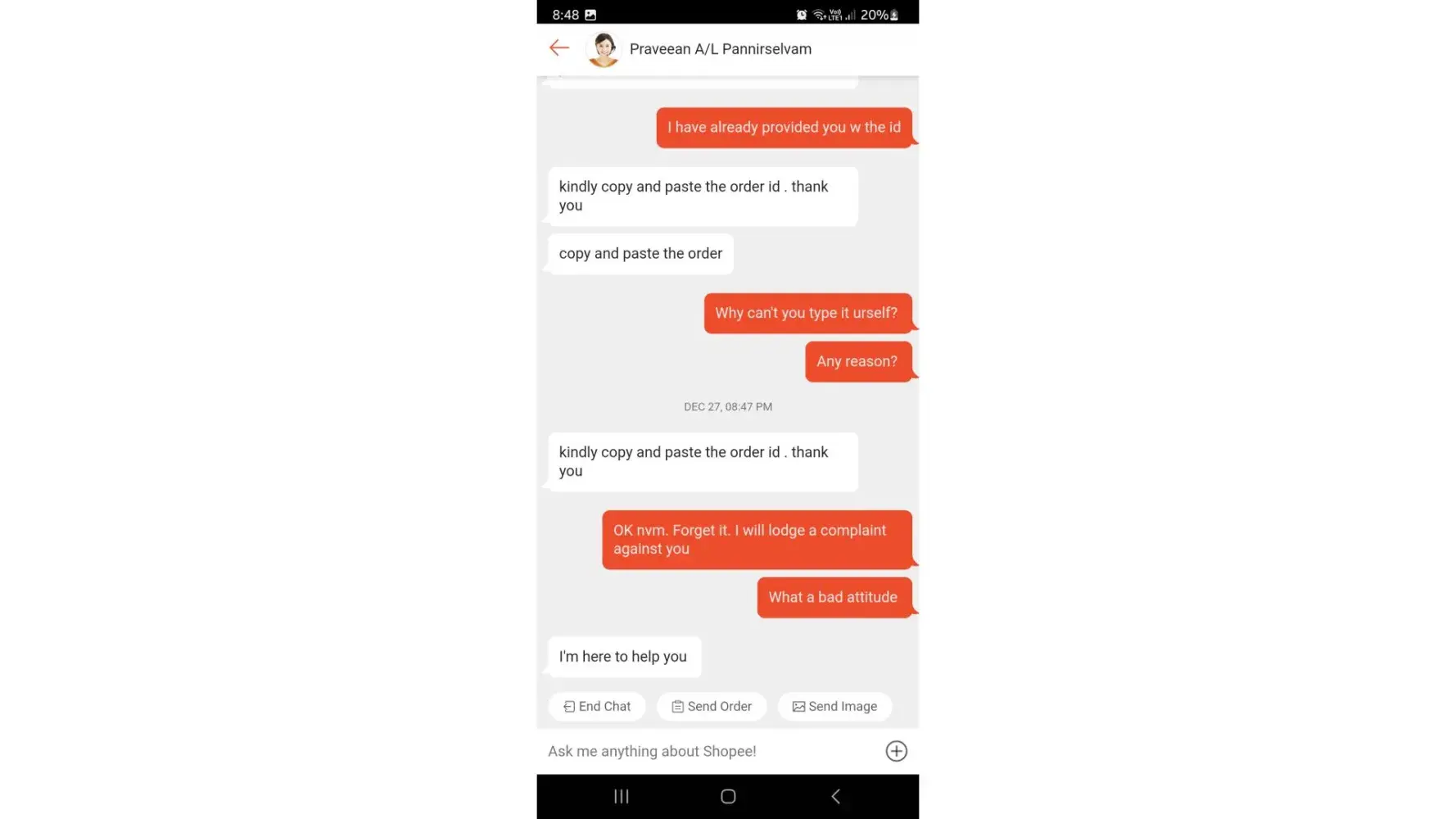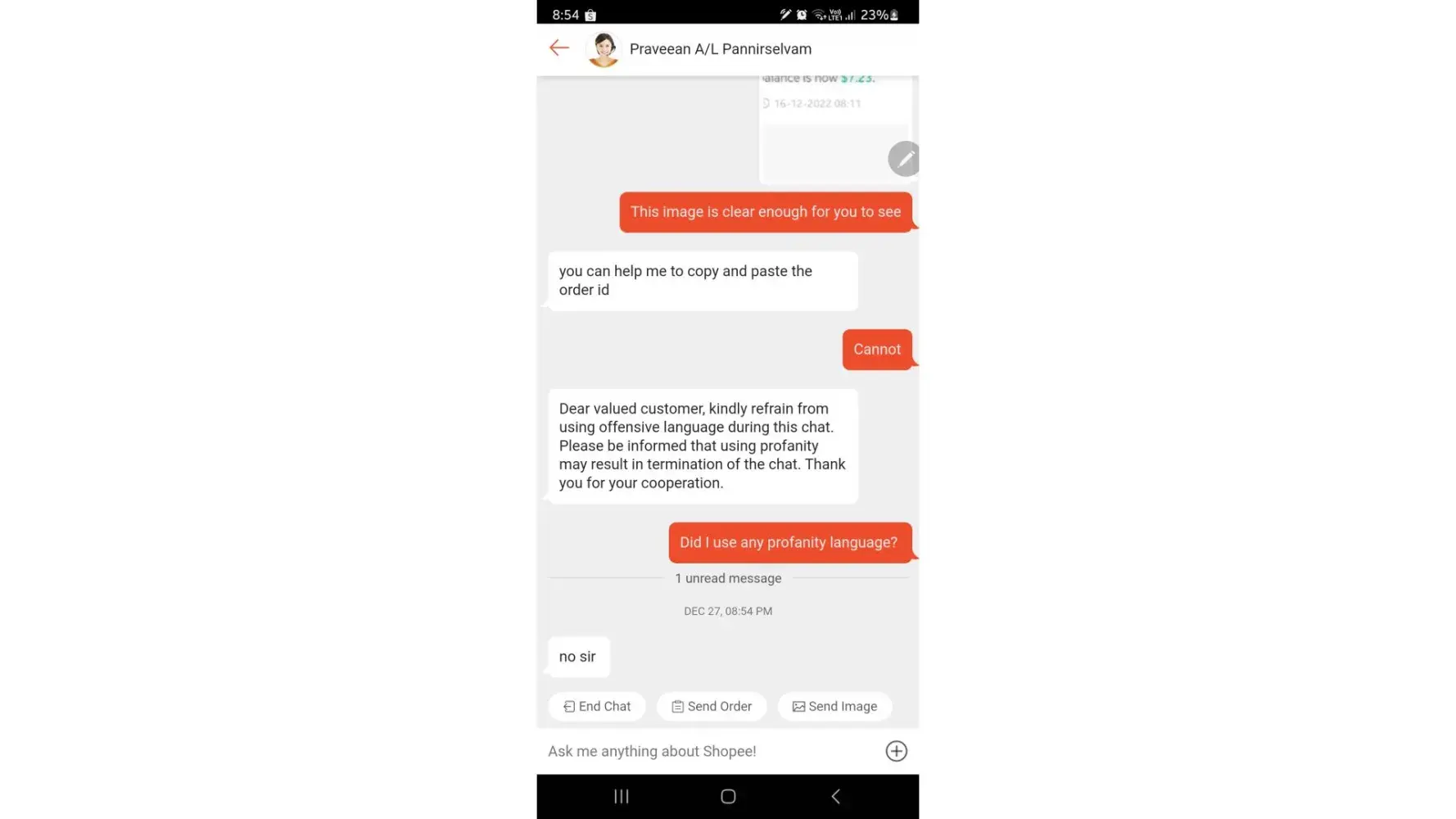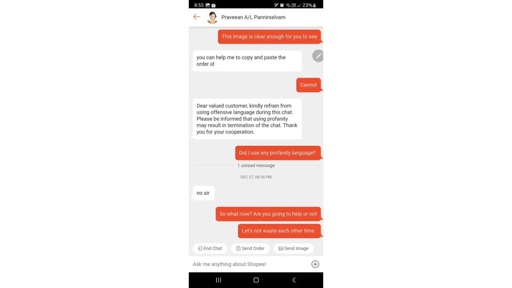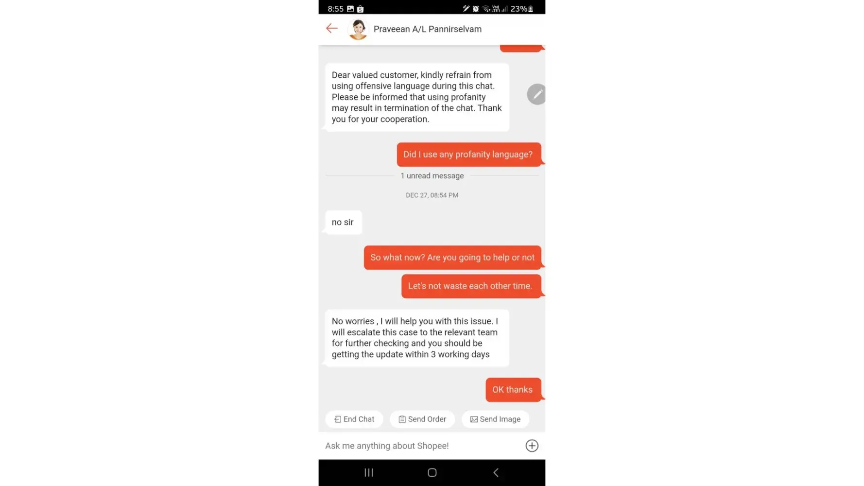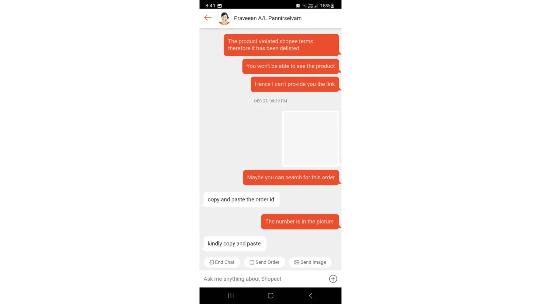 On Tuesday, 27dec22 at around 8pm+ I was supposed to chat with a shopee agent to resolve my item delisted issue but instead of having my issue resolved, I encounter a bad attitude customer service officer by the name of Praveean A/L Pannirselvam.