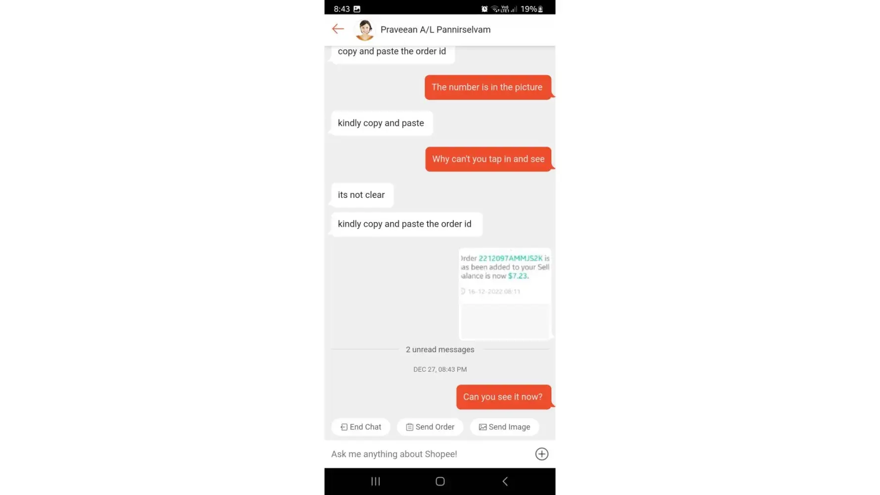 After I have told him that my product has been delisted and therefore I can't provide the link to my product. I send him a screenshot of my previous order. Instead, he ask me to type out the order id. You can refer to the attached screenshot. Let me know if he has an attitude problem.