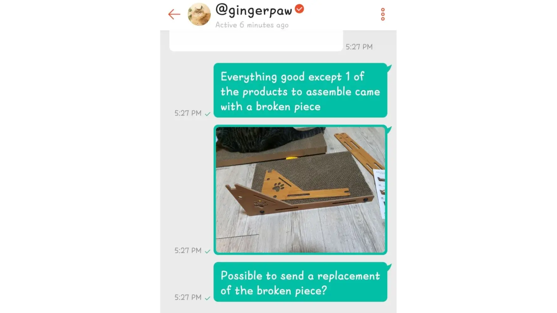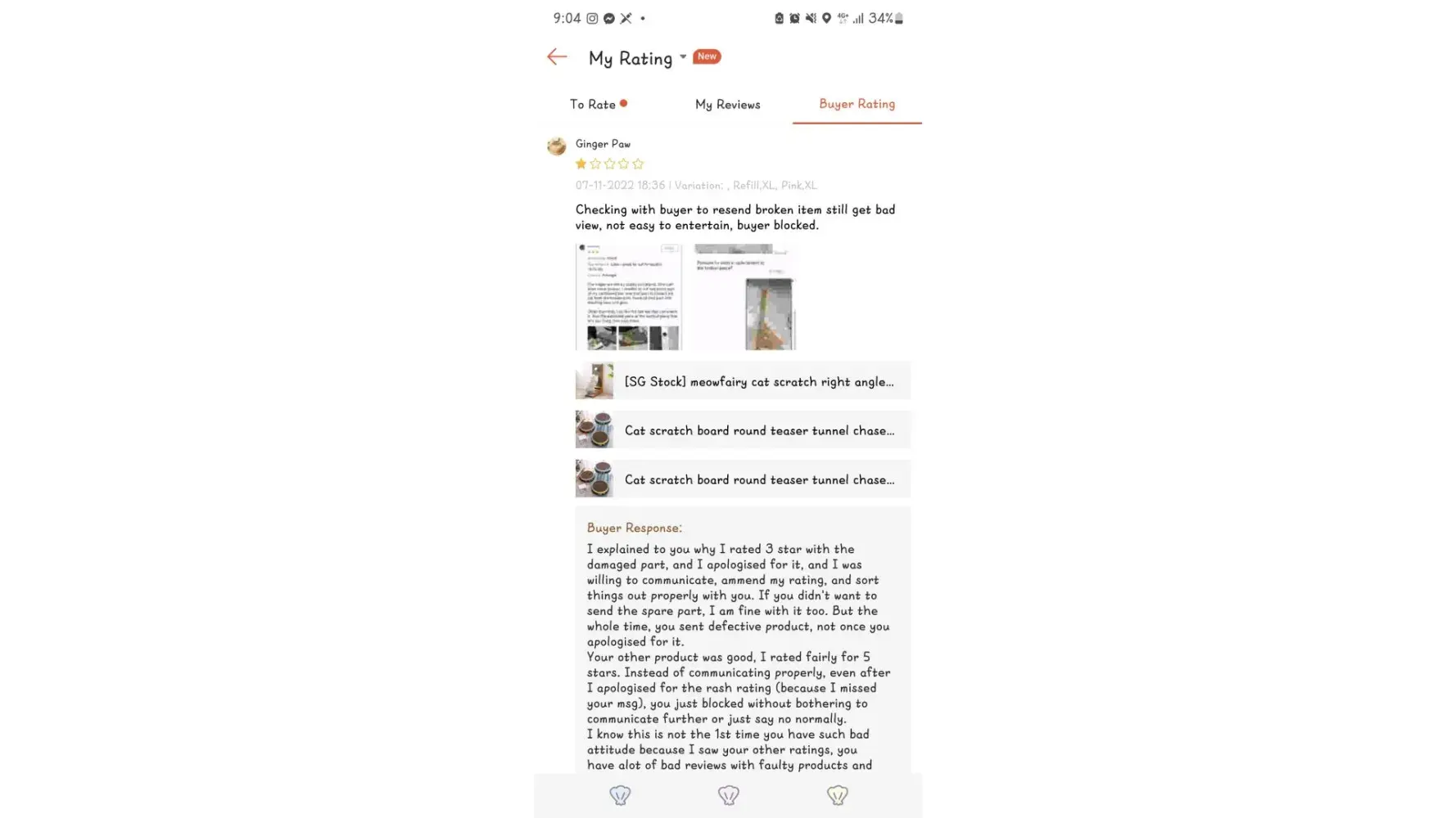 Seller sent defective product with broken parts. I messaged for replacement, but was still very upset by the defective product, and because most of the time on shopee, sellers usually ignore when there's something wrong with the product, so in my jaded-ness, I just gave the rating 1st. I admit that this part I was being rash, but I was understandably upset as defective products shouldn't even be happening, and the broken part has a sharp edge which could potentially injure my cats.
