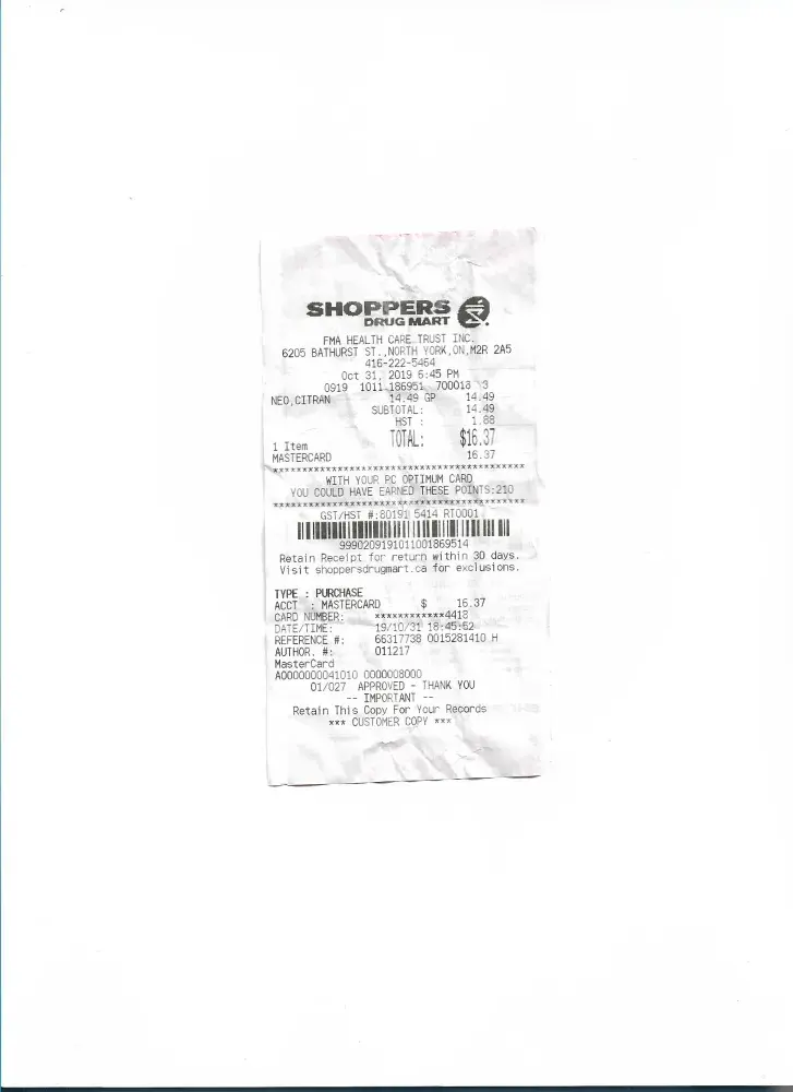 Hi I purchased "neocitran extra strength cold & sinus night apple cinnamon" from shoppers drug mart located at the above address and I paid 14.46+ 1.88 (hst)= $ 16.37 I had no choice but to buy and consume the above product as I was having a very hard time due to cold and bodyache on oct 31, 2019. After visitng the other stores such as metro, no frill...