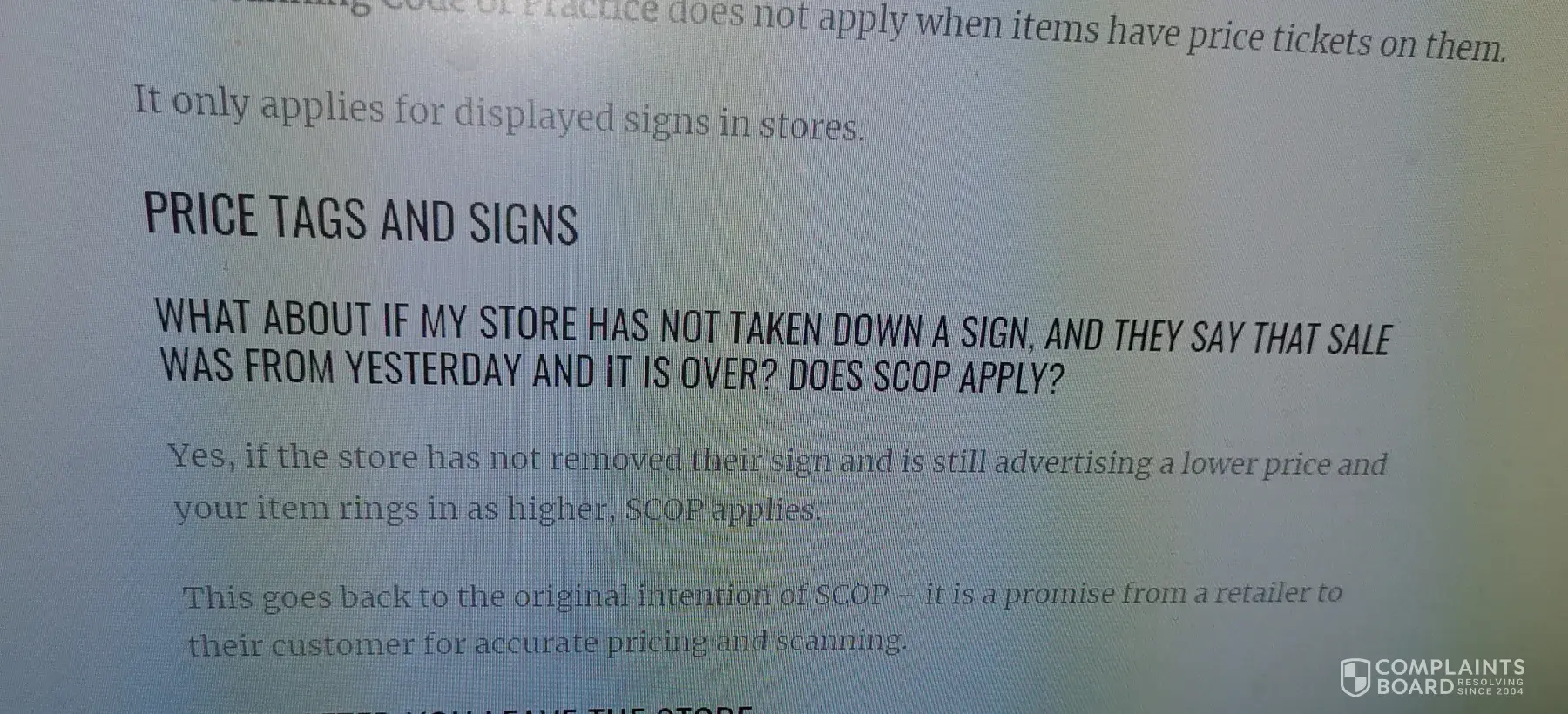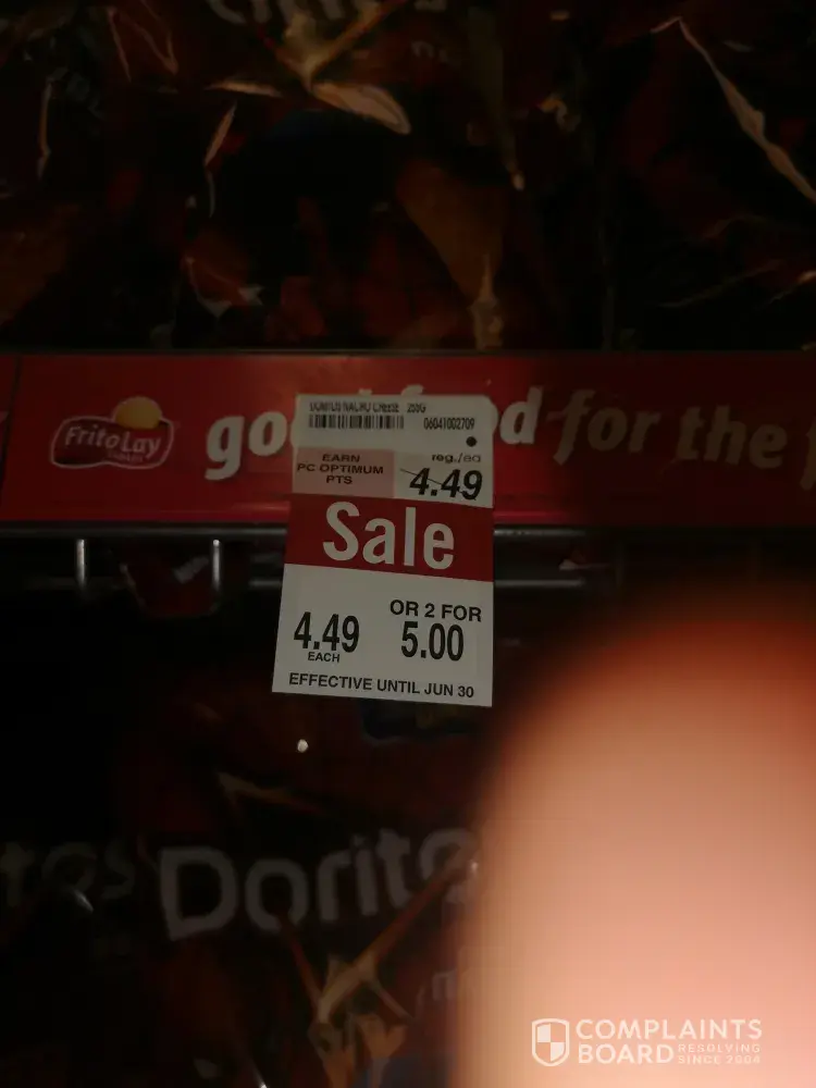 I bought two bags of Doritos as the sticker on the shelf clearly said they were 2 for 5 dollars. I did not realise it till i got back to the car that I was charged full price for the Doritos. I went back into the store to show them there mistake. The manager came over and refunded the original price and then rang them through the till at the sale price of 2 for 5 dollars. I asked if they followed the Scanning code of practice and the manger said yes. I said well then should i not get these bags of chips for free. She said it is not part of the SCOP as it was an expired sale that was still tagged on the shelf, I explained to the manager that would be exactly what would be covered under the SCOP, she continued to tell me No I was wrong. there was a huge line of people forming behind me and I did not have the time to argue with the manager over who was right and who was wrong. So i paid for the chips and kept all the receipts I have attached photos of all receipts, as well as a photo of the tag on the shelf and a photo of the SCOP that clearly says it is covered under it.