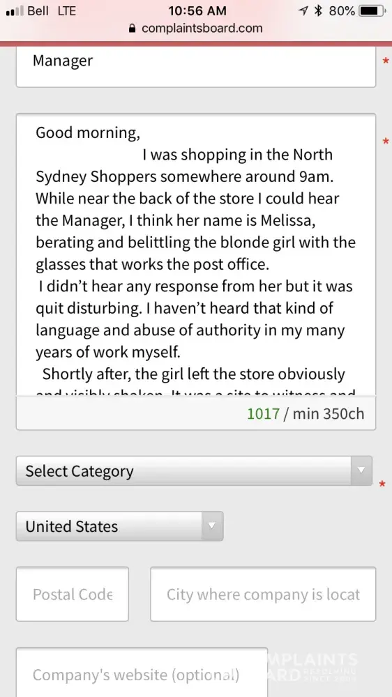 I was shopping in Shoppers Drug Mart in North Sydney around 9am. While near the back of the store I could hear the manager, I think her name is Melissa, berating and belittling the blonde girl with the glasses that works the Post Office.