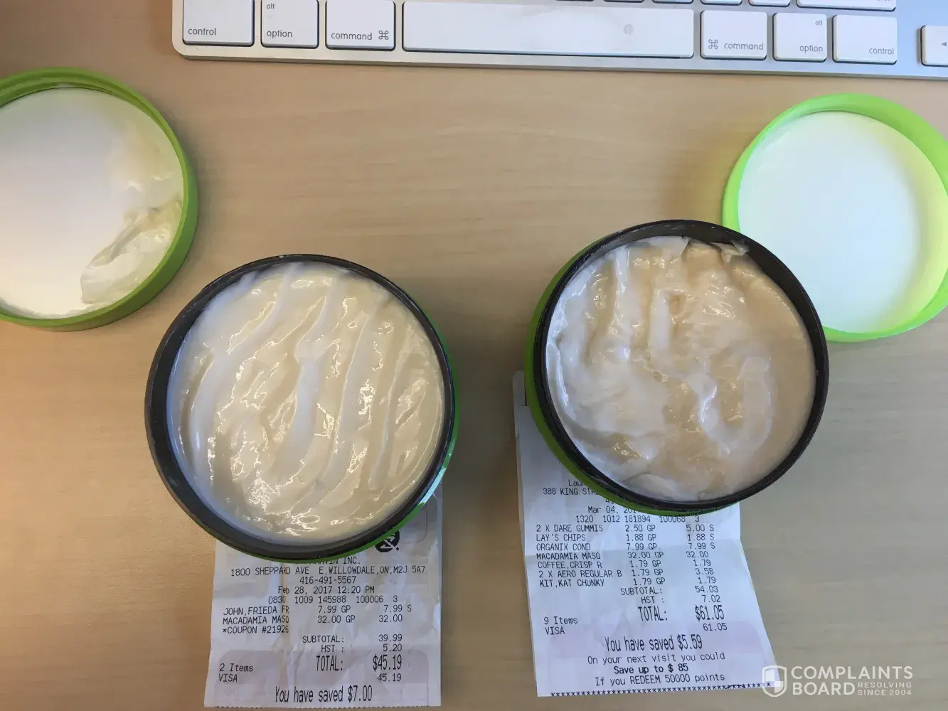 Please see attached images of the fake creamy product on the left and the pearlescent authentic product on the right. The packaging of the product differs as well. Receipts are below each product as proof of where each was purchased.