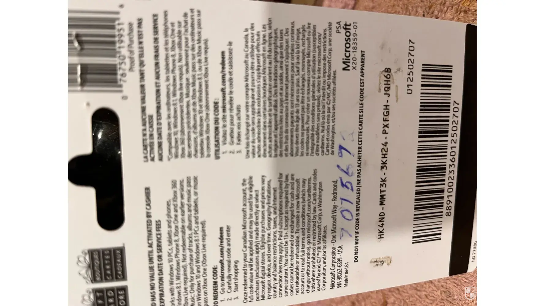 Bought the card on monday the 16th and was told it had already been redeemed have pics of the card and the receipt... As well as a print out from shoppers about this soon as somebody can contact me with an email would be happy to send them to you do not wish another card... Just want my $100 back this is the 2nd time I have ended up with a bogus card from shoppers drug mart also I spent about 2 hours online with microsoft over this... And clearly said it is shoppers drug mart issues as they sold the card and they are documenting this whole affair [protected]@rogers.com